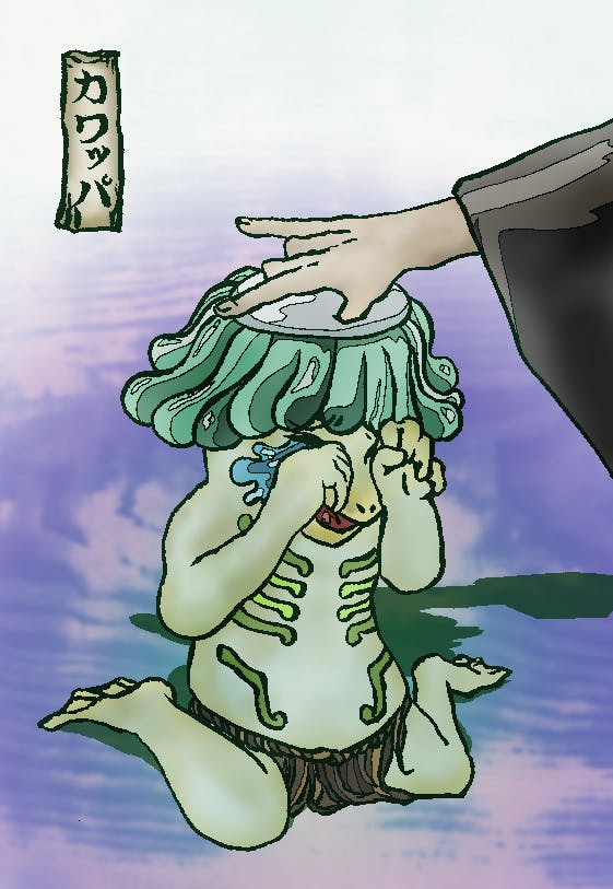 ↑山梨県富士河口湖の河童「カワッパ」。頭の上の3つの穴が弱点。