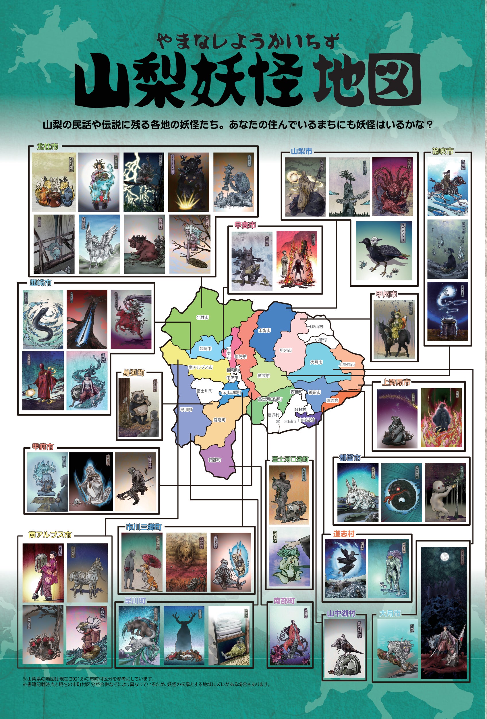 そうして描いた妖怪を集めて、山梨の地図にあてこんだのが画像の「山梨妖怪地図」です。
