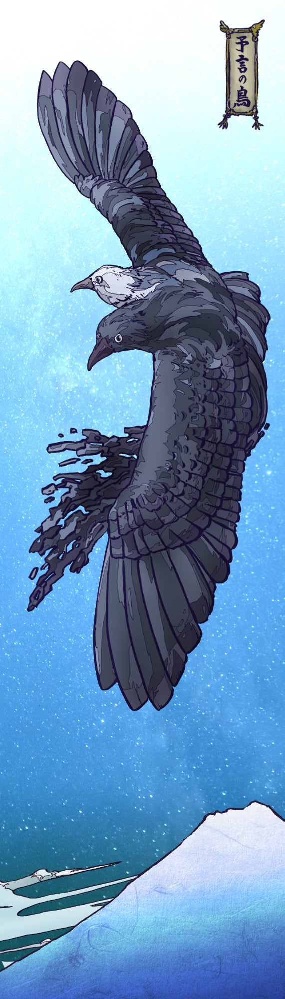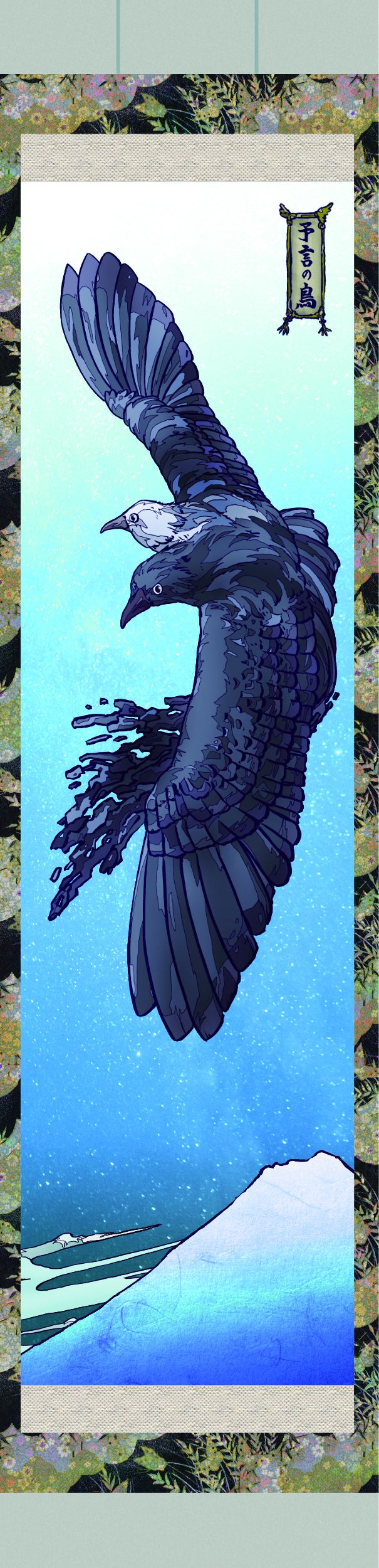 地面に立っている姿で描かれることが多いヨゲンノトリですが、雄大に羽ばたき富士山を越えていくさまを表現しました。疫病なんかふっとばせ!
