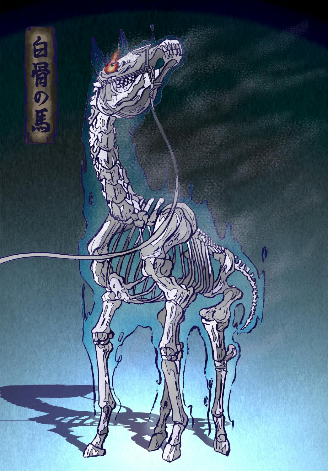 タイトルは『上高下の馬頭天神』ですが、祀られる前の『白骨の馬』の表記をとって妖怪として描きました。