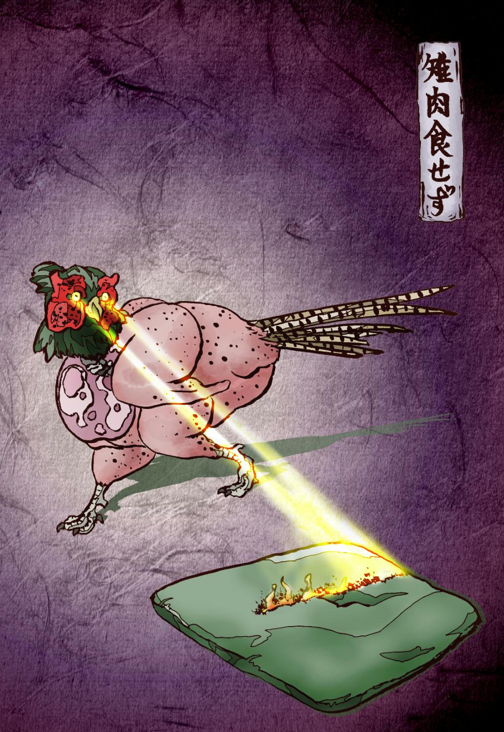 「雉を食べる」をどう表現したものか、と考えたすえ、このような絵になりました。