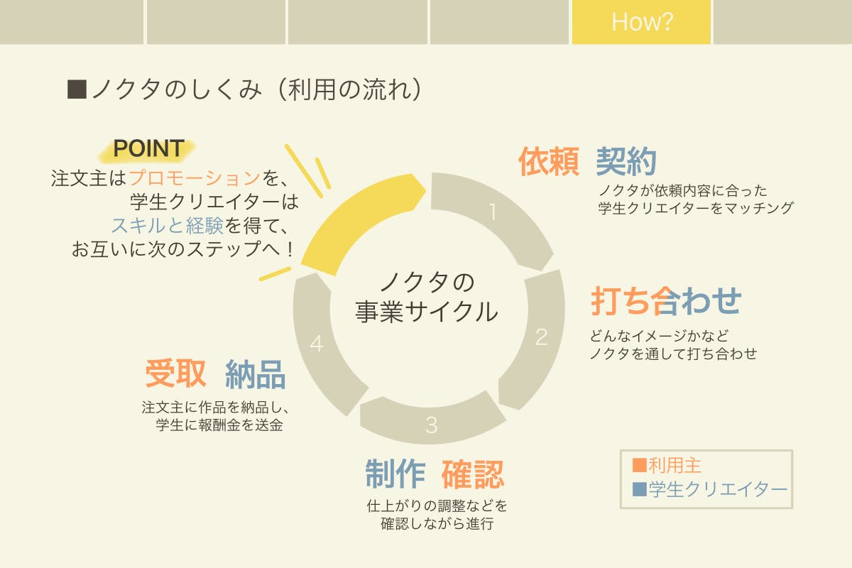 1)依頼:ノクタにほしいプロモーション素材の依頼申し込みをします。/契約:ノクタに学生クリエイターとして登録し、紹介された仕事に承諾確認し契約します。