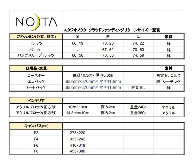 各種リターンの詳細なサイズおよび素材などは以下の表をご参照ください。ご不明な点はお問い合わせいただけましたら迅速にご回答いたします。