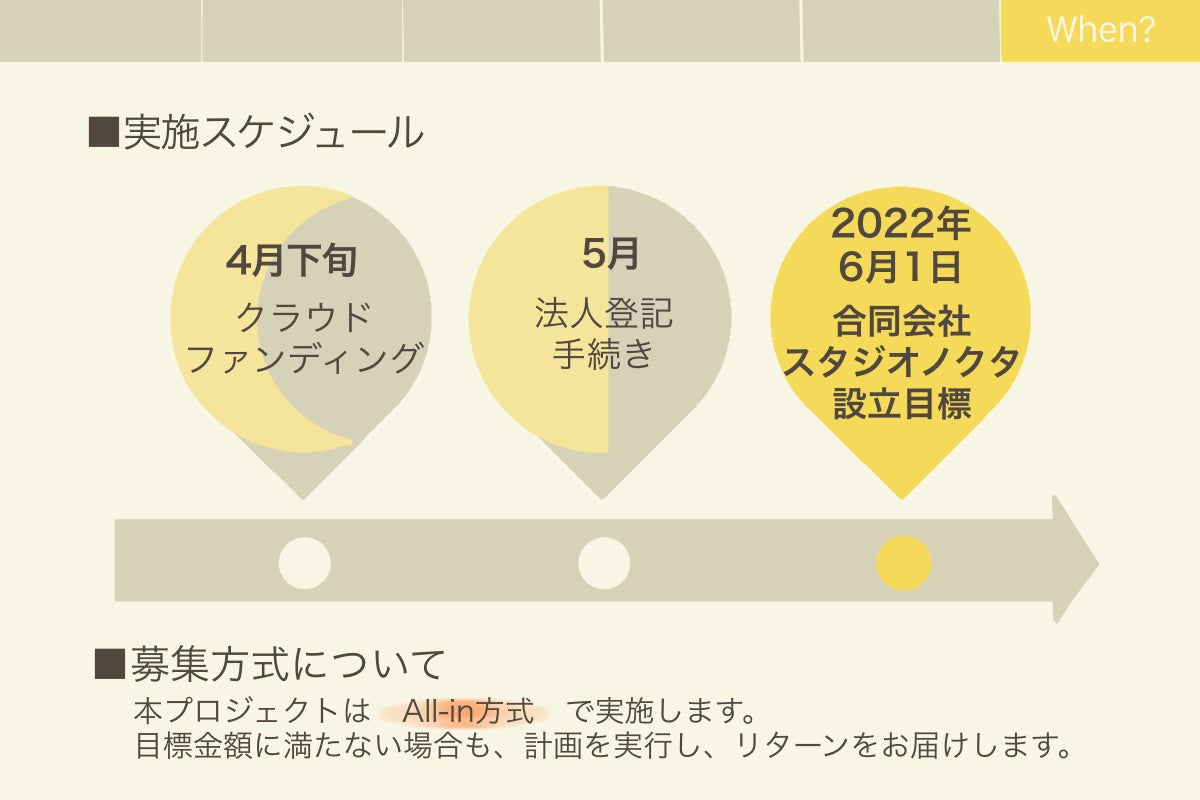 このクラウドファンディングの目的は、開業資金を集めることです。私たちは第一に本事業の立ち上げ、そして最終的には合同会社スタジオノクタの設立を目標としています。私たちは私たちの誠意をより分かっていただいてより多くのプロモーションを手助けするために、任意団体に留まるのではなく法人格の取得に挑むことにしました。