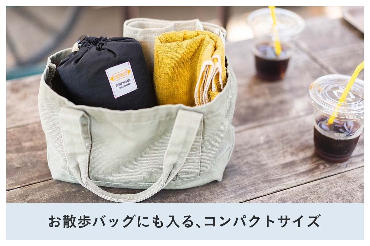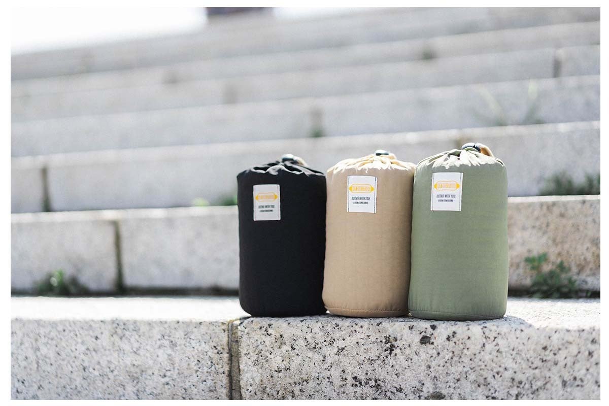 コンパクトに収納できる袋付き。ピンク→ブラック / カーキ→カーキ / チャコールグレー→ ベージュ の袋がそれぞれついてきます。