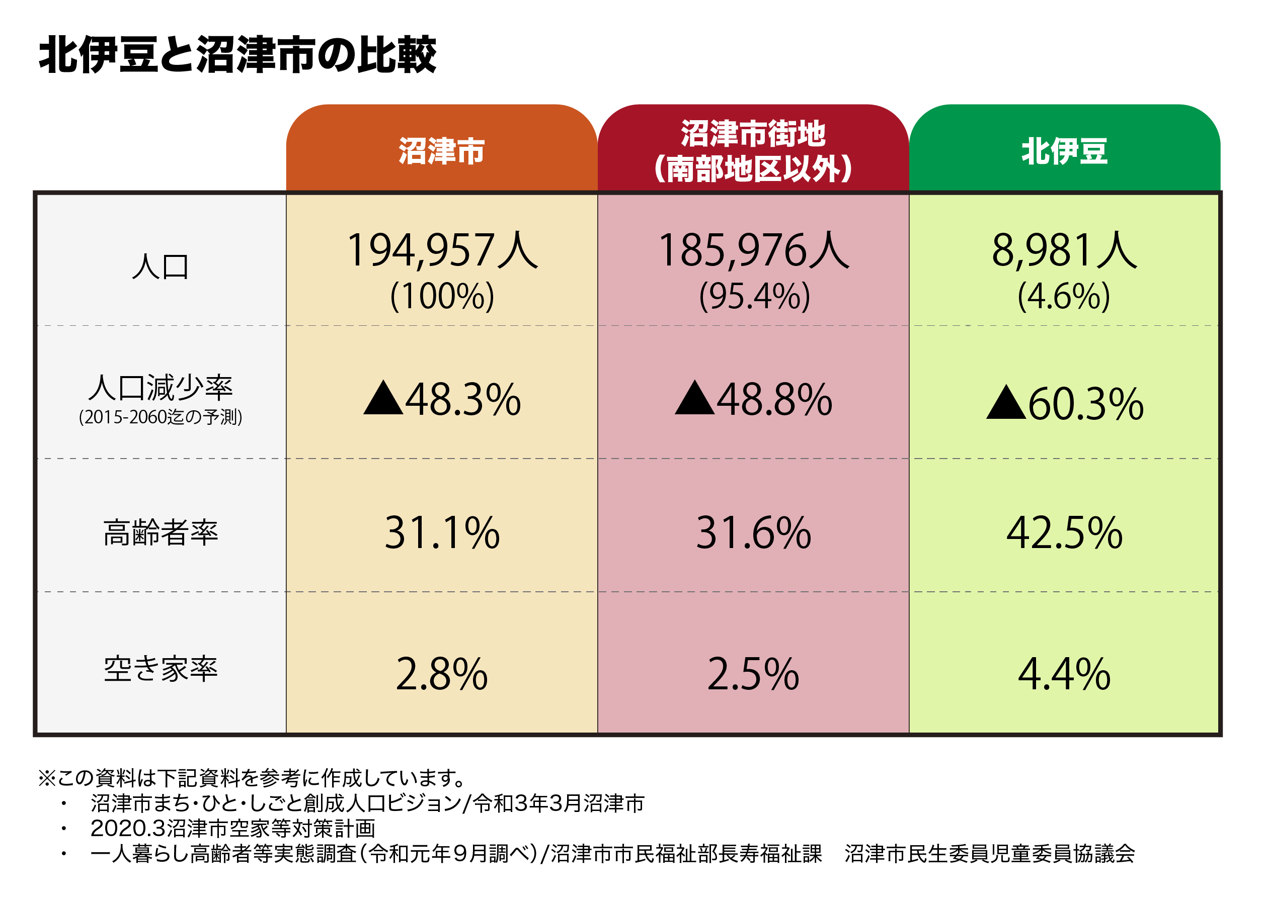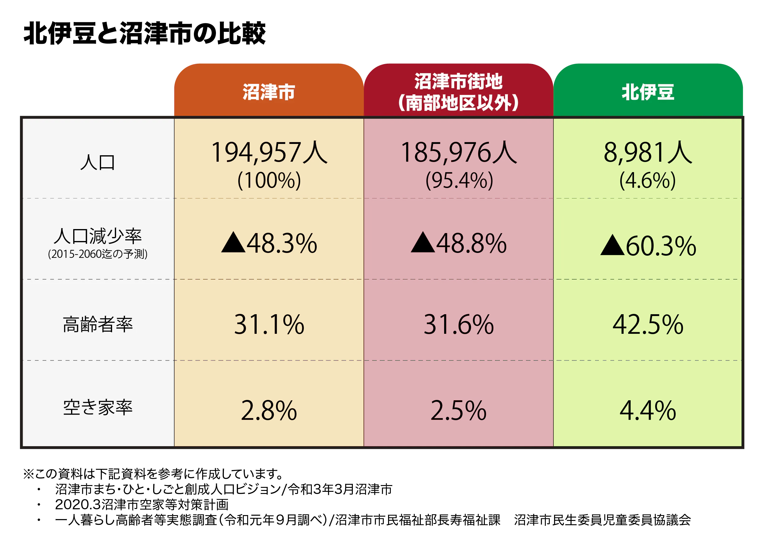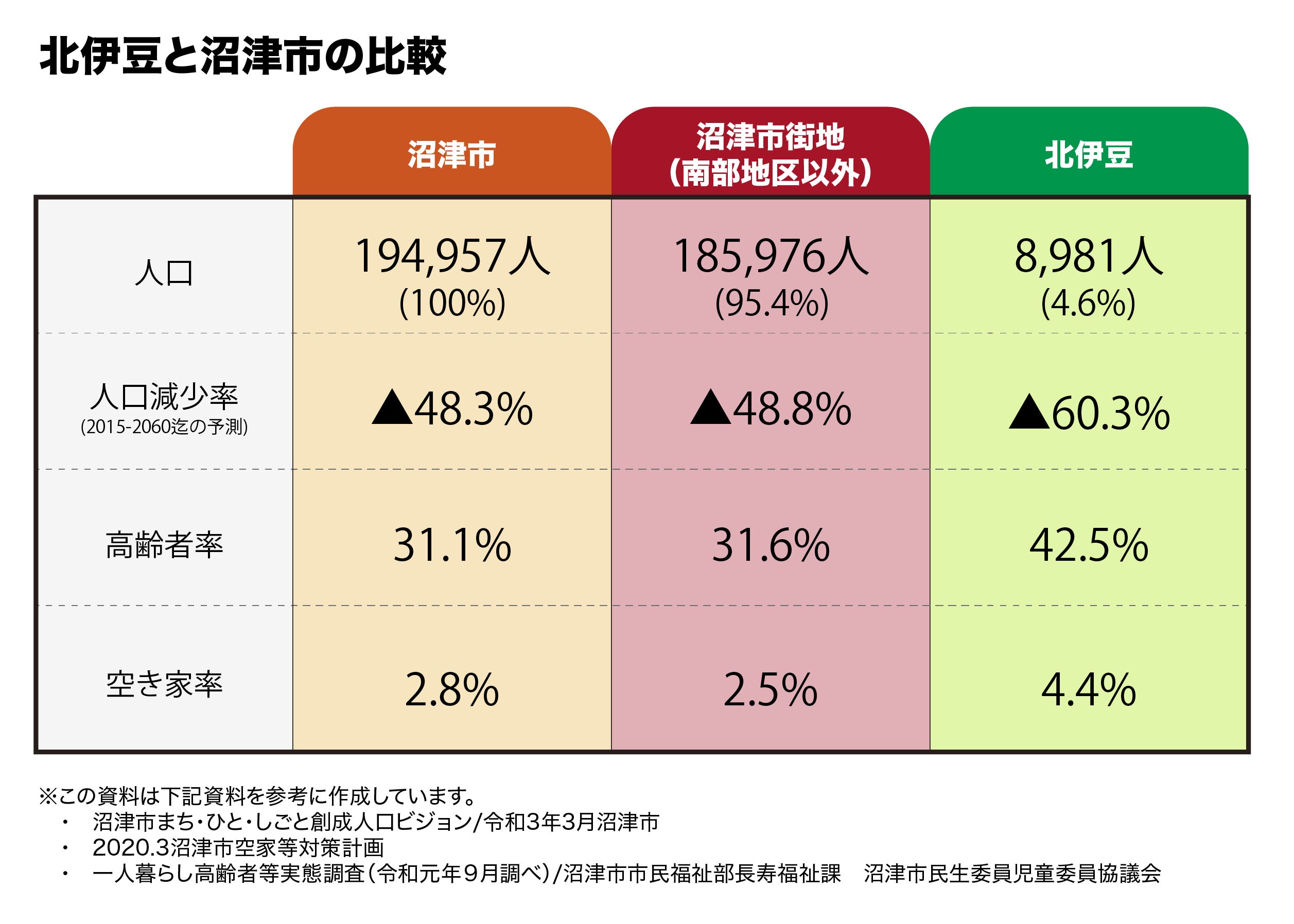 北伊豆は沼津市内の一部地域(静浦・内浦・西浦)を指していますが、沼津市街と少し様子は違っています。自然に囲まれた地域で比較するとよくわかりますが人口減少率、空き家率、高齢者率どこをとってもいわゆる「地方の田舎」です。