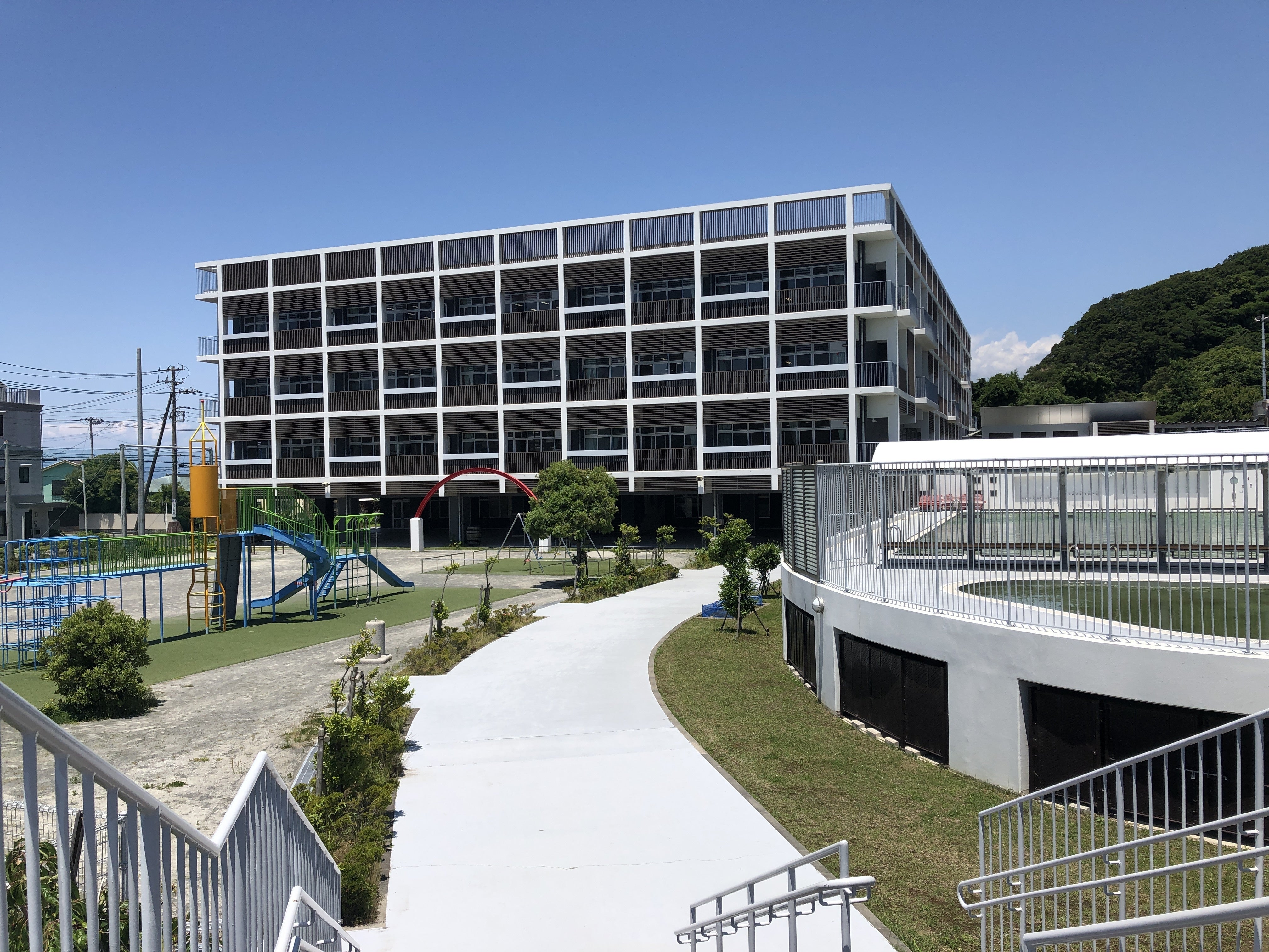 静浦小中一貫校は、平成26年4月に新築では県内公立校で初となる施設一体型小中一貫校として開校しました。校舎も新しく海が近いため災害時の新たな避難場所としても期待されています。
