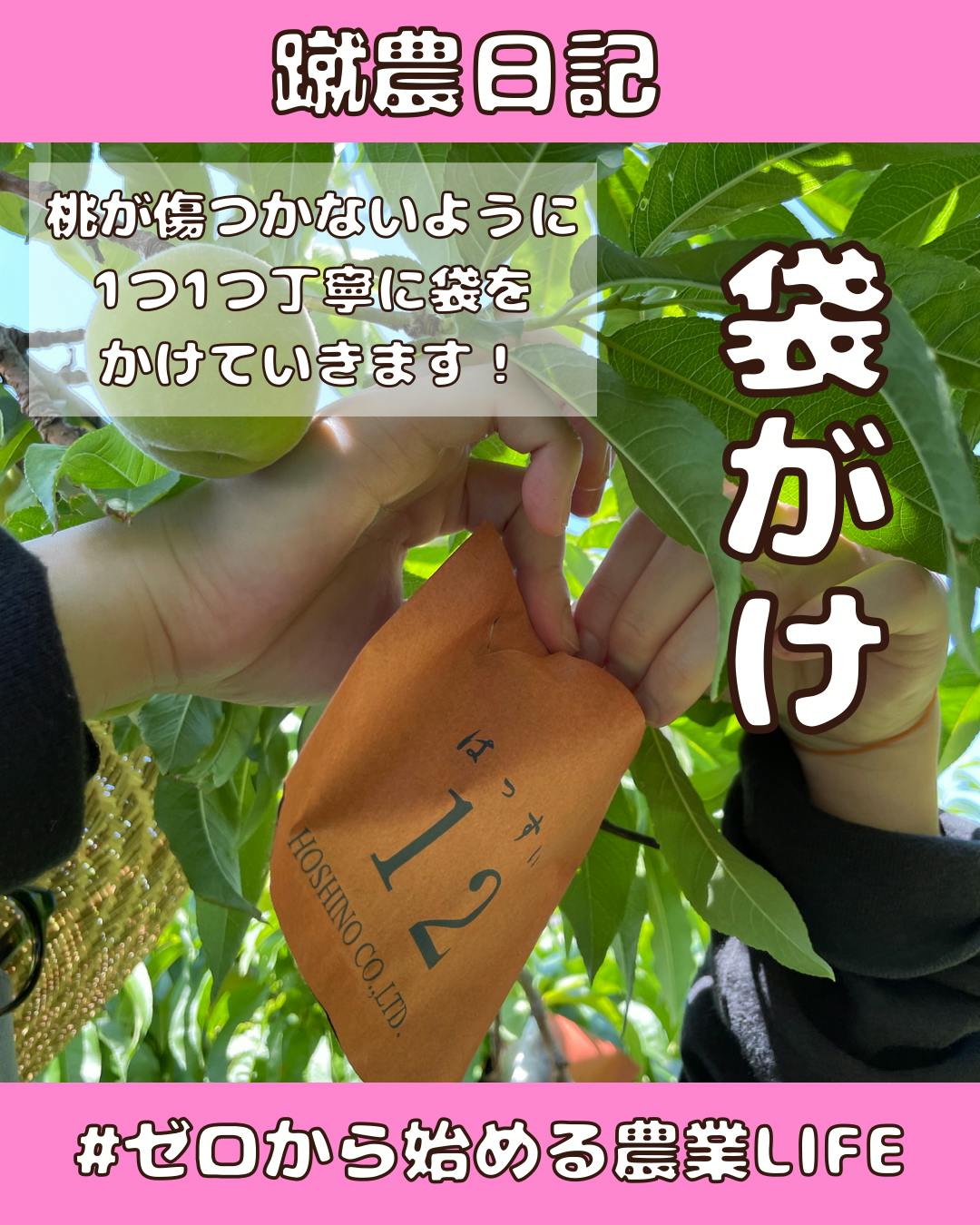 2022/06/06 20:002022/06/05(日)作業内容:桃の袋がけ本日は桃の袋がけを行いました!桃に袋をかける理由は多々あります。・雨、風から桃を守る・虫や鳥から桃を守る・枝や葉っぱが擦れて傷つくのを防ぐなどなどです。桃の実は非常にデリケートな為、少しの傷で品質が大幅にダウンしてしまいます。それを防ぐために今回の“袋がけ”では桃をガードするための紙袋を一つの桃に対して一枚かけていきます。1本の桃の木にだいたち300個前後桃を実らせる為、非常に気が遠くなるような作業ですが、全員で協力しながら奮闘しています!!皆様に美味しい桃がお届けできるよう頑張ります!! もっと見る