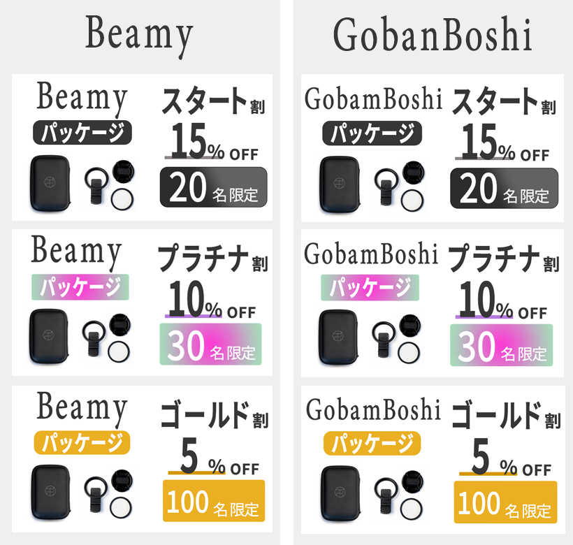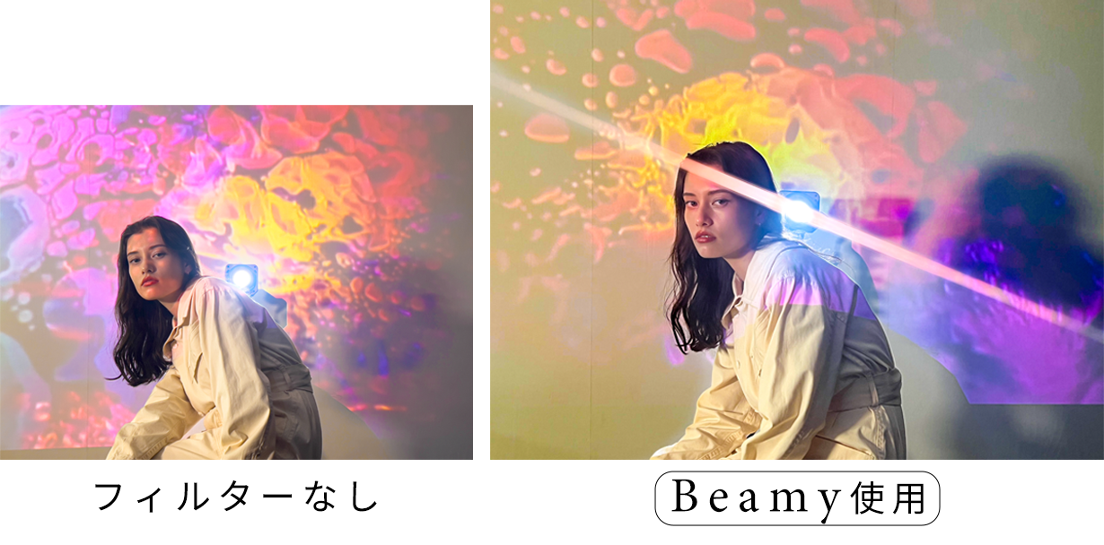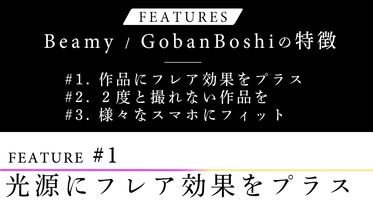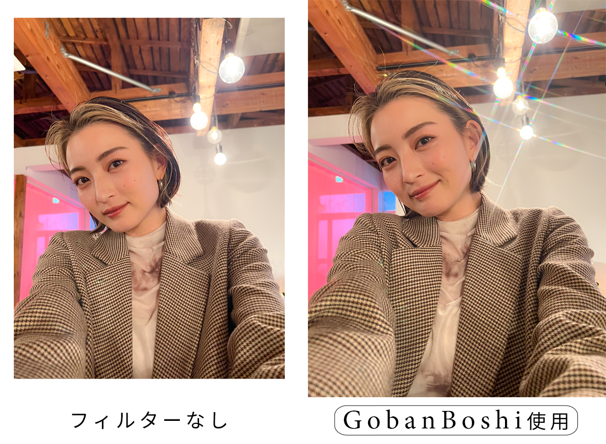 Beamyには平行のライン、GobanBoshiには碁盤の目状のラインが、フィルターガラスに施されており、そのラインに沿って光の部分が伸びることで、フレア(=閃光)が映し出され、「エモい」タッチの写真/動画が撮影可能に。