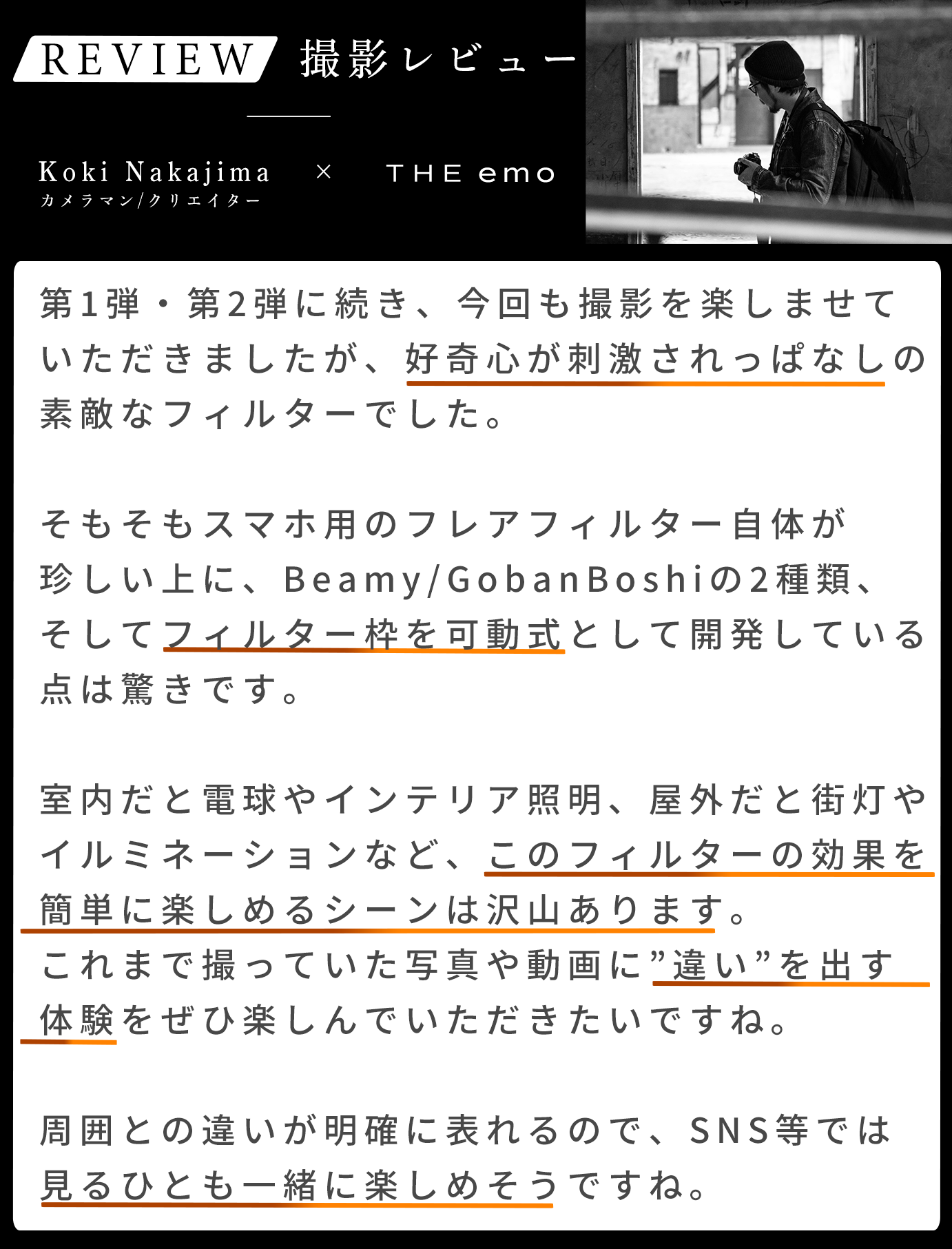 今後も様々なスマホカメラ用フィルターを開発し、見るひとの感情を震わすような作品を撮影するお手伝いができればと考えているので、是非ともいただけますと幸いです。