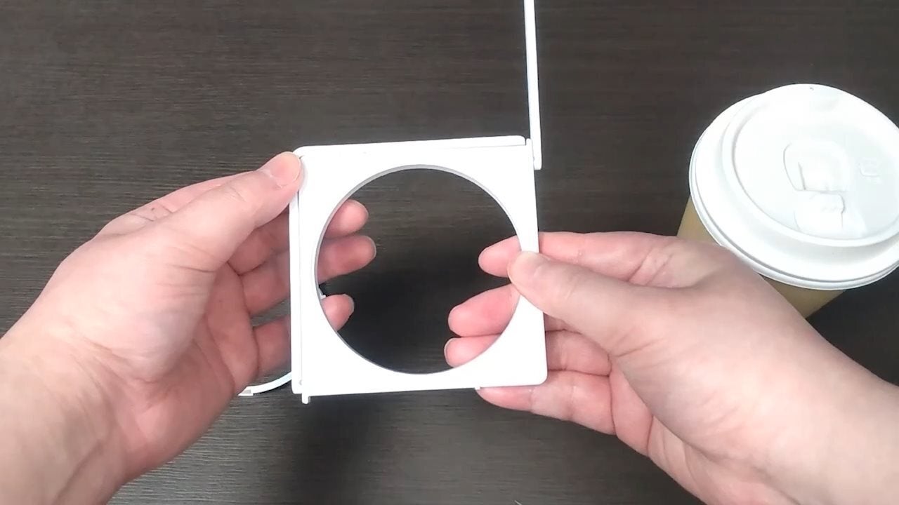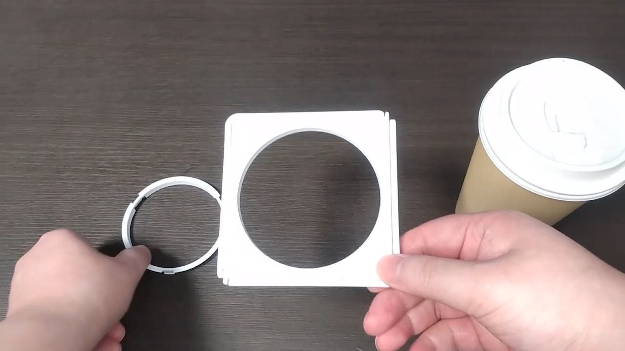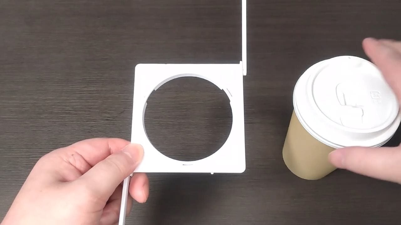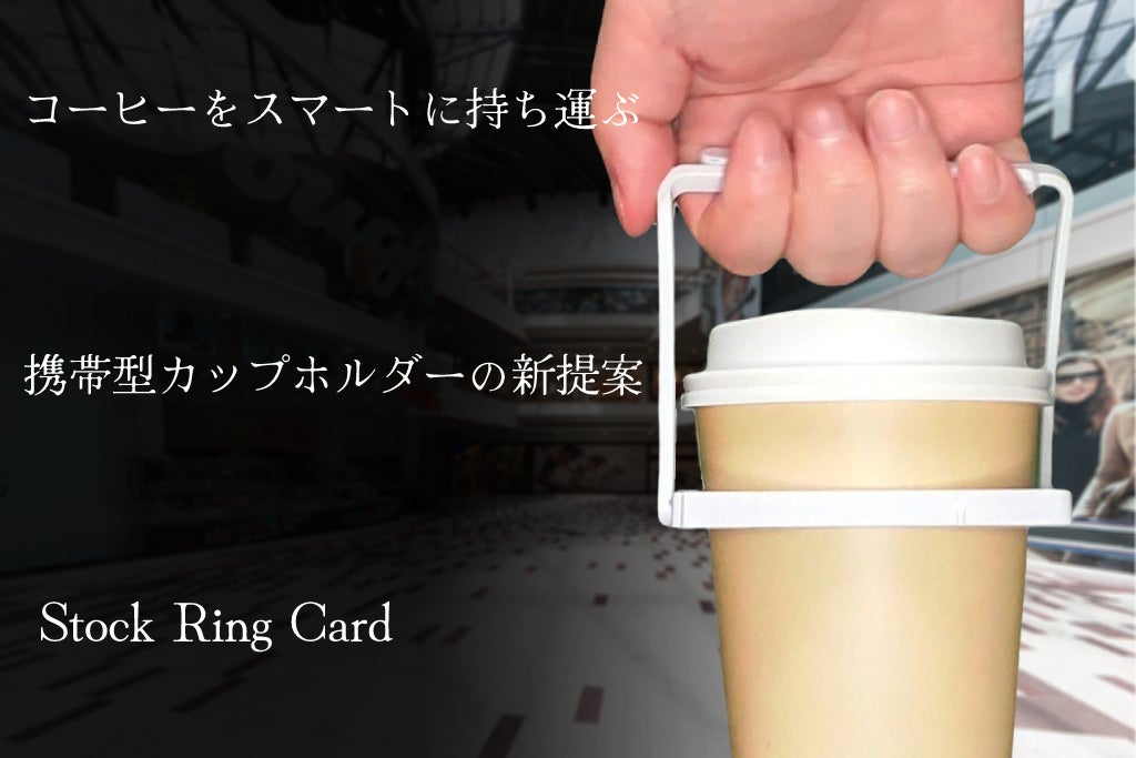 Stock Ring Cardは、穴の空いた板状のコンパクトな状態から、ハンドルを展開することでカップを保持して持ち運びできるようにする携帯型のカップホルダーとなります。