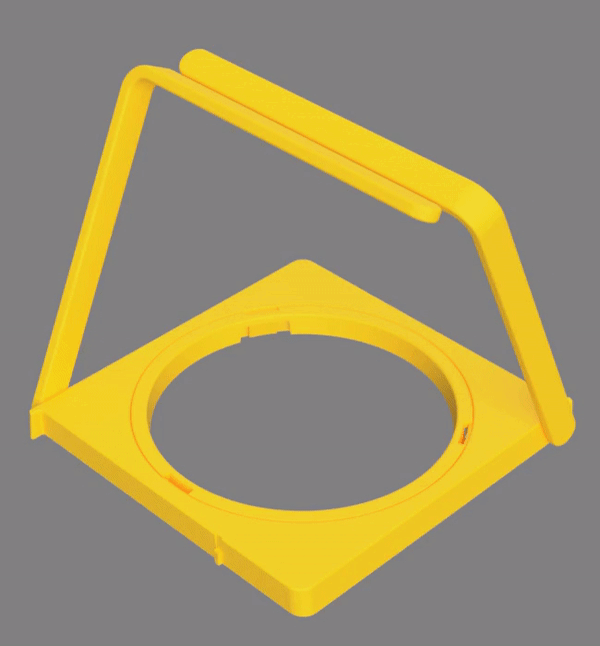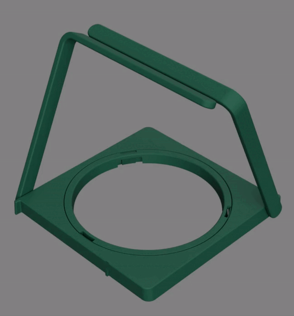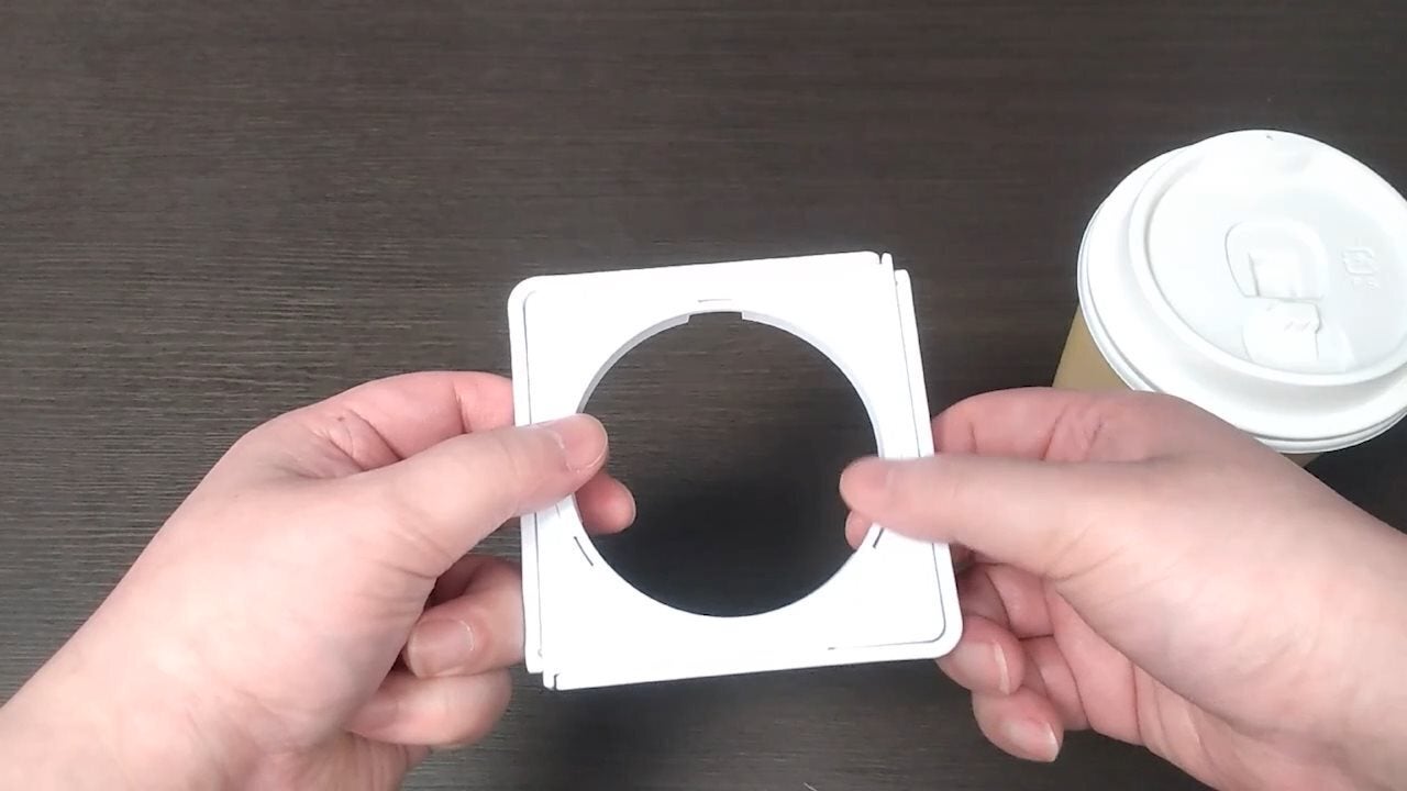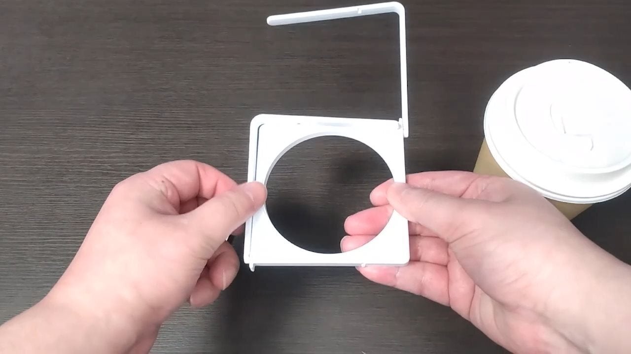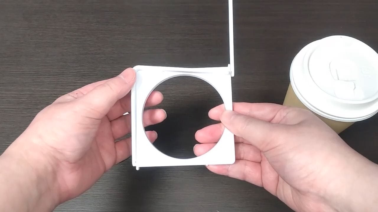 Stock Ring Cardは、穴の空いた板状のコンパクトな状態から、ハンドルを展開することでカップを保持して持ち運びできるようにする携帯型のカップホルダーとなります。