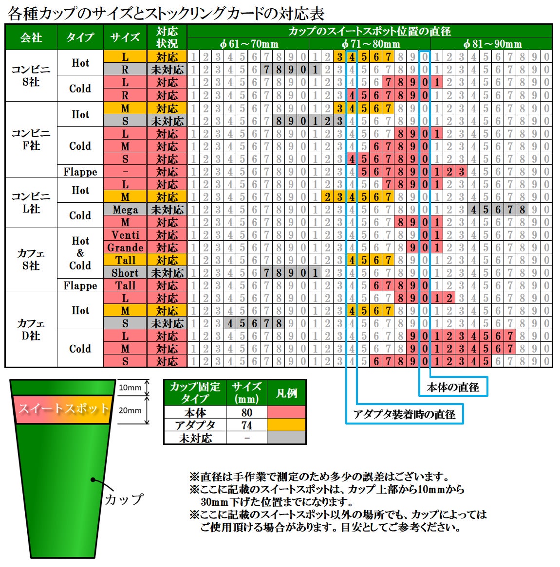 カップ保持部(固定する穴)のサイズは、国内で使用されているカップの多くに対応しています。一部、対応していないカップは、規格外に大きいか、ホットSサイズのようにとても小さいものとなります。