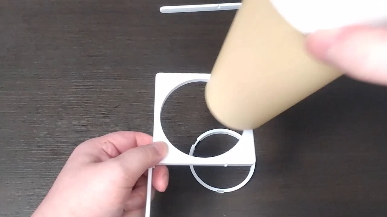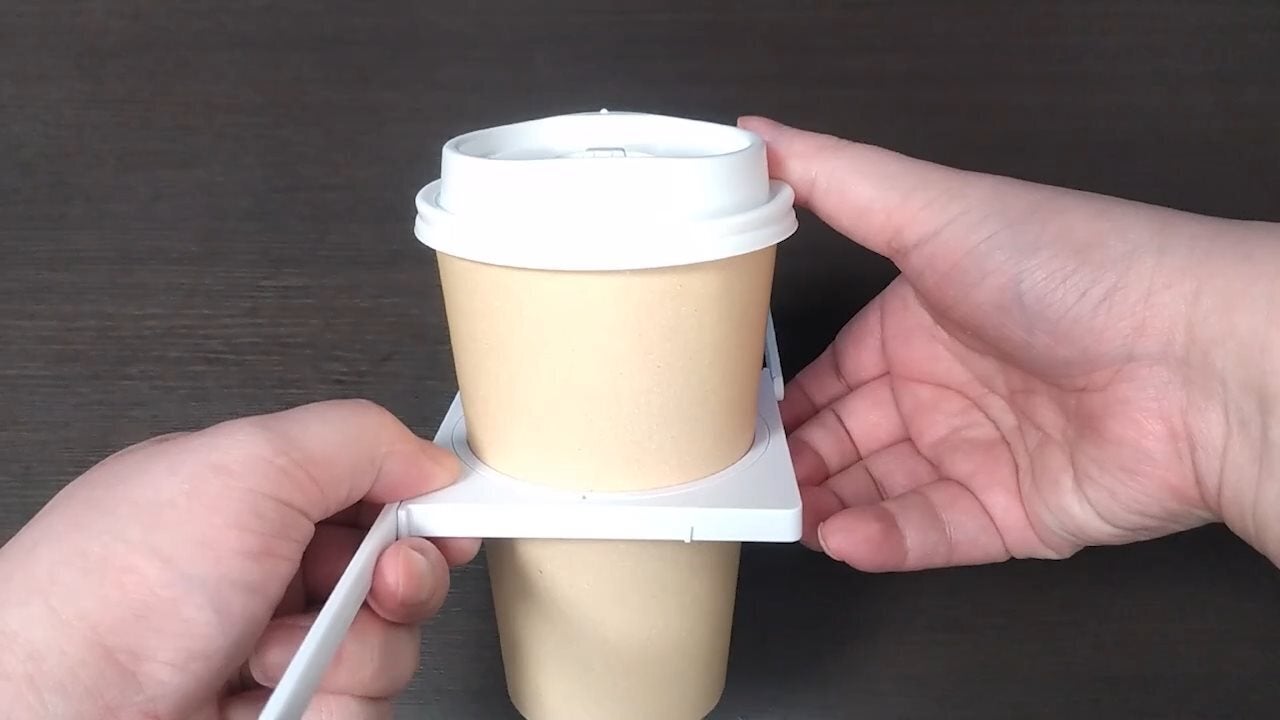 使い方は、コーヒーを注文して抽出している間にStock Ring Cardのハンドル部分を展開して待ち、受け取ったカップをStock Ring Cardの穴に通して固定してから、それぞれのハンドルを中央部まで閉じて握るだけです。