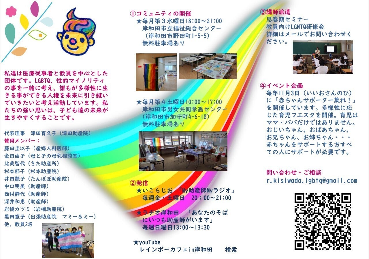 ■活動の発信に、ラヂオ岸和田https://www.radiokishiwada.jp 毎週日曜日13:00~13:30番組「あなたのそばにいつも助産師はいます」から、助産師をはじめとする医療従事者、LGBTQ関係者をゲストに迎え発信しています。コロナ禍で混乱した医療現場、COVID-19陽性患者を訪問診療される医師、看取りをされている訪問看護師さんの声は力強いものでした。テレビやインターネットから流れるコロナ禍の情報は「誰を信じていいのか?」と不安と孤独ではなかったですか。しかしラジオからの現場の声は、聴いている人を安心させ希望をもたせてくれました。反響があったのは、ご自身が性違和を感じながら生活されているLGBTQ当事者の方が、人間関係がうまくいくエッセンスや表現方法を語っていた声でした。過去の on airはYouTube(レインボーカフェin岸和田で検索)でご視聴できます。今後もラジオから町の保健室活動を発信していく予定です。
