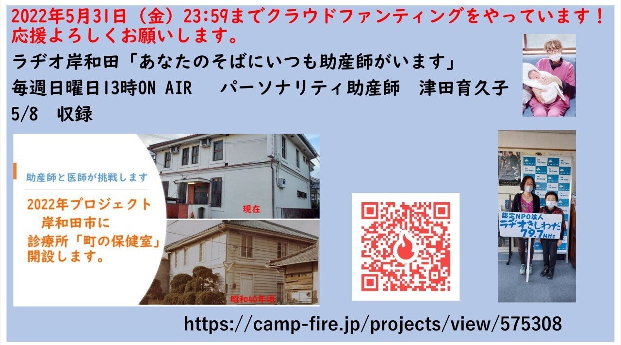 2022年5月9日現在、支援者数100人、ご支援金2,294,500円。医師と助産師が挑戦する「岸和田・町の保健室」のクラウドファンティングをしています。その思いをラヂオ岸和田「あなたのそばにいつも助産師がいます」で、ねね助産院芦田千恵美助産師さんと稲田君代助産師さんとトークしました。地域活動の中で社会問題にぶつかり、解決に導くうえで岸和田市下野町に拠点を置くことにたどり着きました。しかし拠点となる建物の老朽化と耐震の問題にぶちあたっています。その為に1,000万円目標のクラウドファンティングをしています。クラウドファンティングあと22日を残し、多くの支援者を募っています。