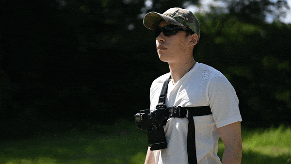 大きなレンズであっても体の中心でカメラを保持するため、レンズが真下に向いて安定し、カメラが視野の範疇に収まります。