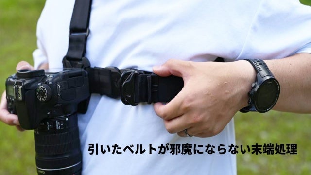ベルトを伸ばすと普通のストラップとしても使えますが、ベルトを絞りピッタリ体に密着することで移動時の体力の消耗が少なくなるのも嬉しいです
