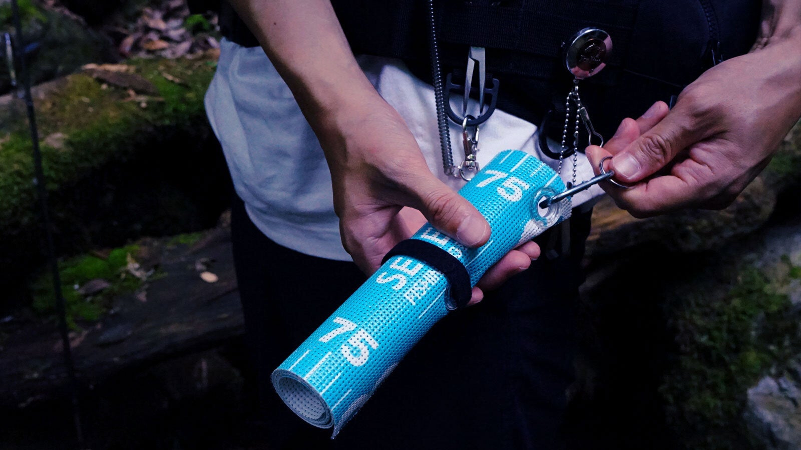 足場が高い位置での釣りでは、メジャーに付属している穴にカラビナとパラコードなどのヒモをくくりつけて水際まで落とし込むか、タモにカラビナを引っ掛けて水につけてあげることも可能です。