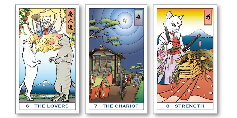 武将、忍者にお姫様…着物を着たねこがお江戸を舞台に大活躍。それが『今はむかし にゃんこたろっと』です。タロットカードに触れたことがない方も、「ねこ」をきっかけにタロットに触れていただければ...と思い、にゃんこ達を主役に、まるで浮世絵のような和風イラストに仕上げました。