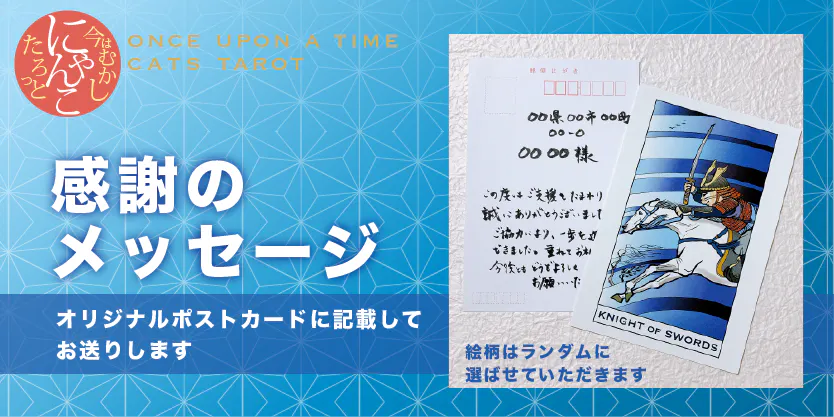 『今はむかし にゃんこたろっと』ではタロットカードの写真をSNSやホームページでどんどんシェアいただいて構いません。インテリアや写真撮影の小物として使用していただいてもOKです。