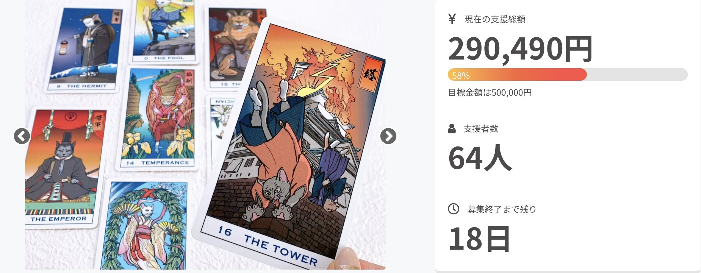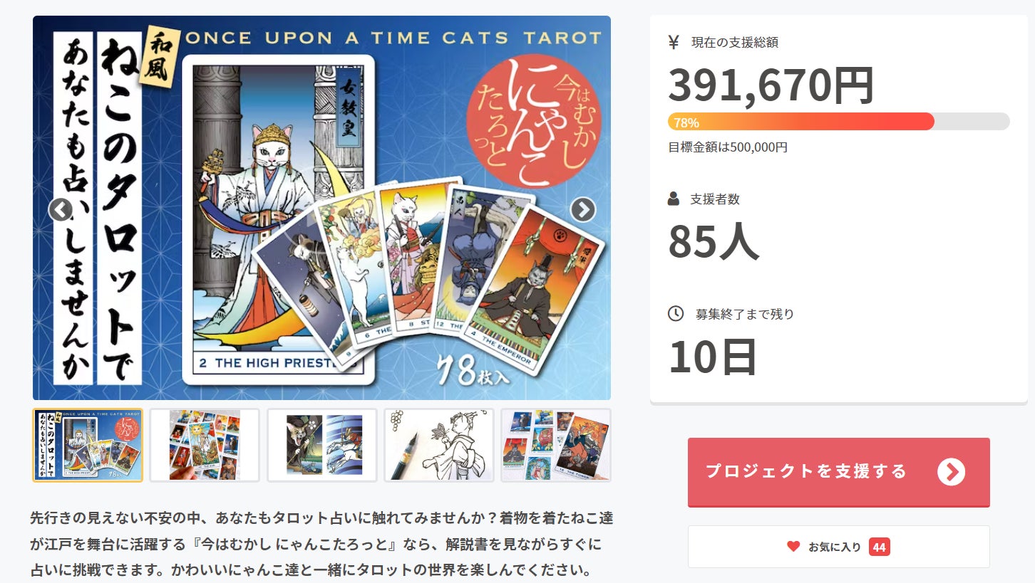 プロジェクトの終了の10月31日まであと10日!皆様のご支援・応援により達成率78%まで到達いたしました。本当にありがとうございます!ご支援くださった皆様から頂戴した「応援メッセージ」の一部をご紹介いたしますね。●ねこタロットを使いたくてタロットの勉強を始めました● 絵がスゴくかわいいですね!● 素敵なカードを作成して頂きありがとうございます他にもたくさんのメッセージをいただいております!本当にうれしく、ありがたく...中には目頭が熱くなるようなメッセ―ジありました。感謝感謝です。クラウドファンディングって「プロダクトの制作費用をご支援いただくこと」というイメージがありましたが、実はそれよりも、もっとも~っと多くのギフトをいただけるものだったんだと判りました。そのギフトとは心のつながり。ご縁のつながり。お顔も知らなかった方々と心が繋がる。お友達とはさらに繋がる糸が太くなる。自分一人の「タロットを作りたいな~」とふわっとした直感から始まったプロジェクトが、あれよあれよと皆様のご縁に導かれて...こんなにうれしいメッセージをいただける日が来るなんて、想像もしていませんでした。募集終了まであと10日!100%に達成できますよう、引き続き皆様のご支援・ご応援・情報のシェアなど、どうぞよろしくお願いいたします。