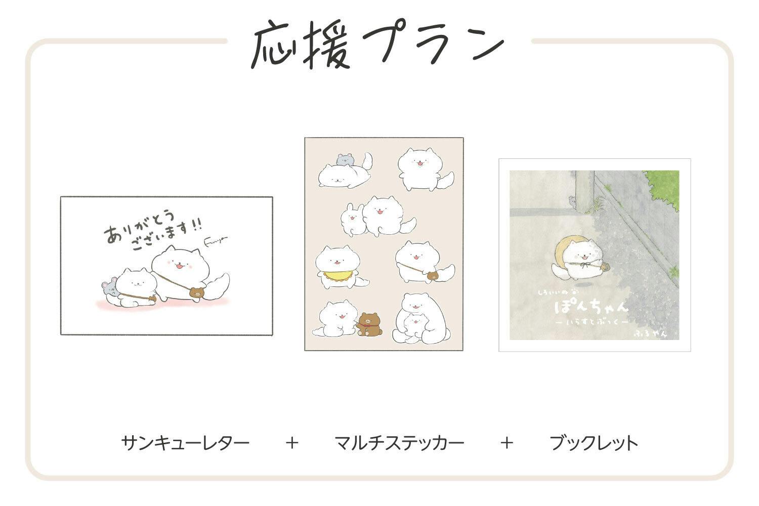 ぽんちゃんのぬいぐるみとクラウドファンディング限定のグッズをお届けします。