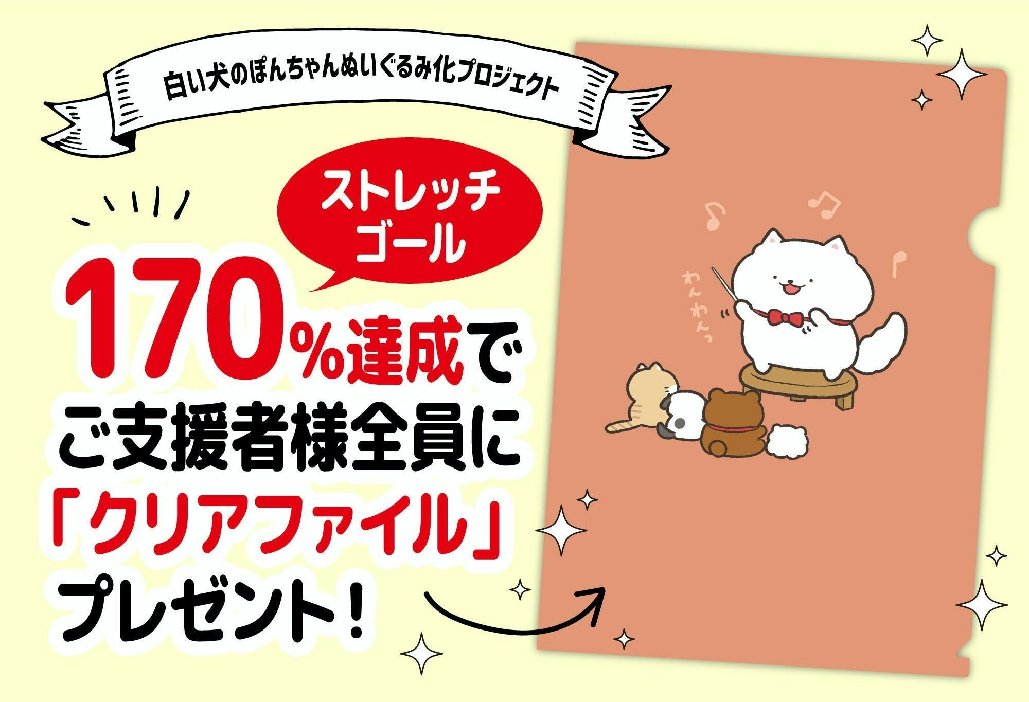 2022/04/26 19:00「白い犬のぽんちゃんぬいぐるみ化プロジェクト」を応援していただきありがとうございます!CAMPFIRE Creationスタッフです。クラウドファンディングは見事サクセスし、募集期間が残り9日となりました。この度、最後までプロジェクトを盛り上げていくために、第二の目標となるストレッチゴールを設定させていただきました!ストレッチゴールの目標となる「170%」を達成した場合、記念として支援者の皆様へ、プロジェクト限定「クリアファイル」をプレゼントいたします!※A4サイズを予定しております。クラウドファンディング期間が終わってから入手いただくことはできませんので、終了までにもれなく多くの方に本プロジェクトをご覧いただき、支援の輪を広げていきたいと思っております。ぜひ、最終日までご声援どうぞよろしくお願いいたします! もっと見る