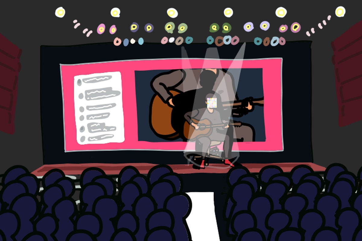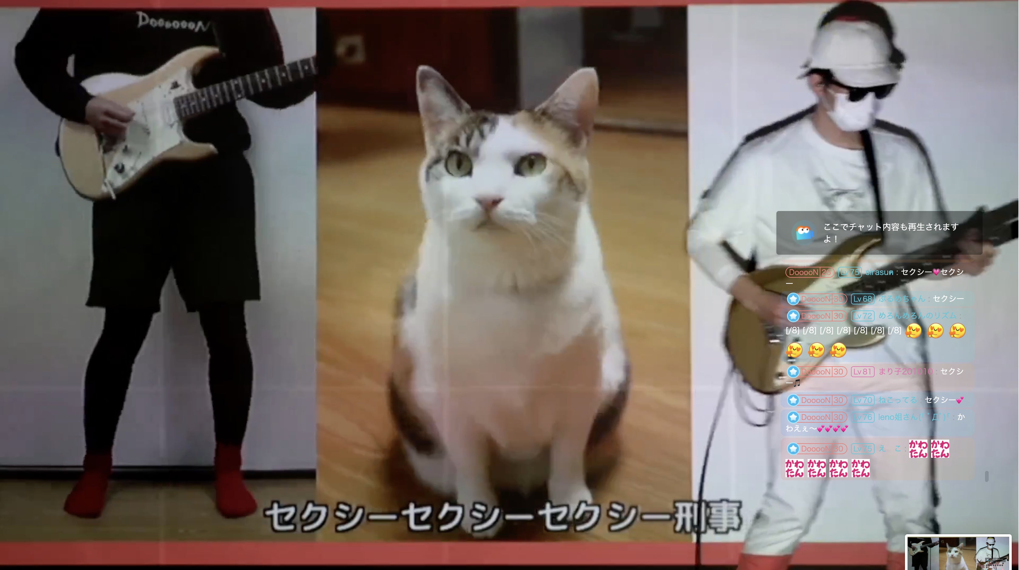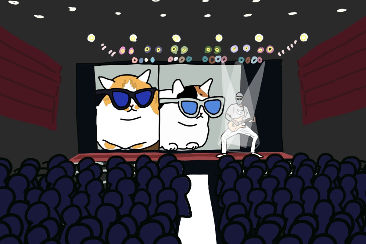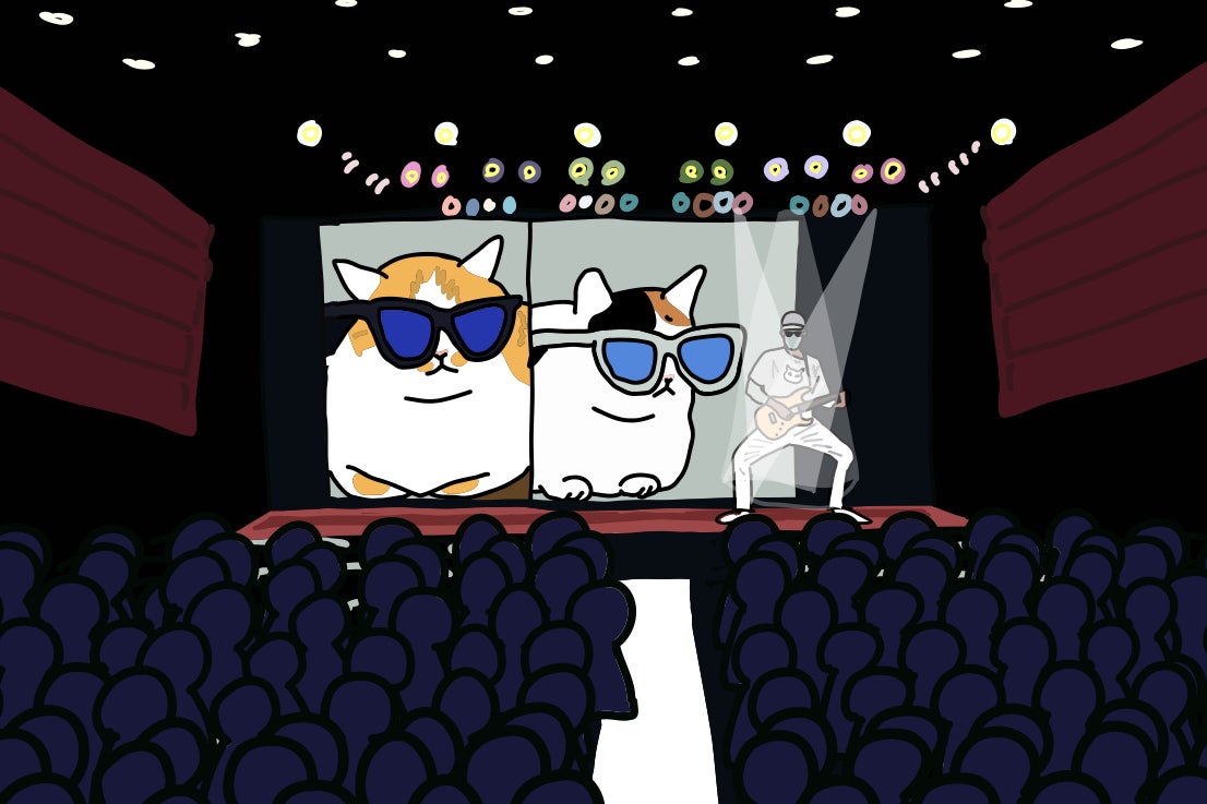 スタッフさんのギター漫談 at Mildom現在もしぬこのSNSフォロワー数やライブ配信参加数を考えると200人を集めることは簡単ではありません。しかし、常にチャレンジし続けたいという想いから200人という人数にしました。そして、会場のSHIBUYA PLEASURE PLEASUREのキャパシティが318名(着席)のためチャレンジする人数にちょうど良いと感じました。また会場の雰囲気もかっこいい。カリンバンドは動画とリアルなギターを融合したLIVEなのでスクリーンを使ってライブを行います。元々映画館を改装してライブホールにしているので248inchの大きなスクリーンと、臨場感のあるサウンド、そして映画館のどこからでも見渡せる座席仕様になっているため理想な場所だと思いました。
