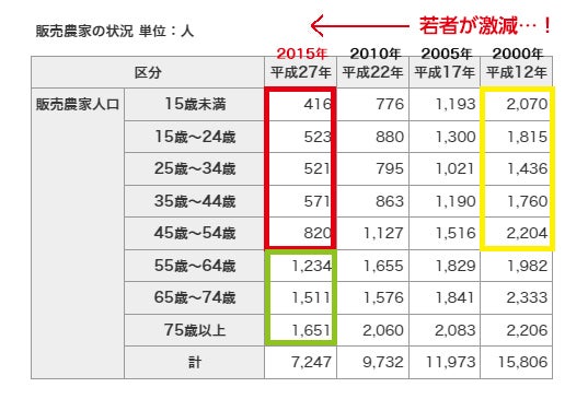 ここ最近、全国の就農人口が少しだけ上昇したという明るいニュースがありましたが、まだまだ問題があります。以下の表をご覧ください。