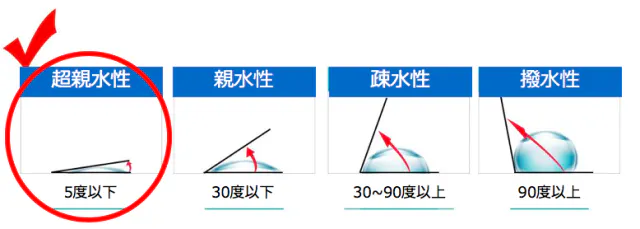 A:角度5度以下の超親水性膜を形成しているため。