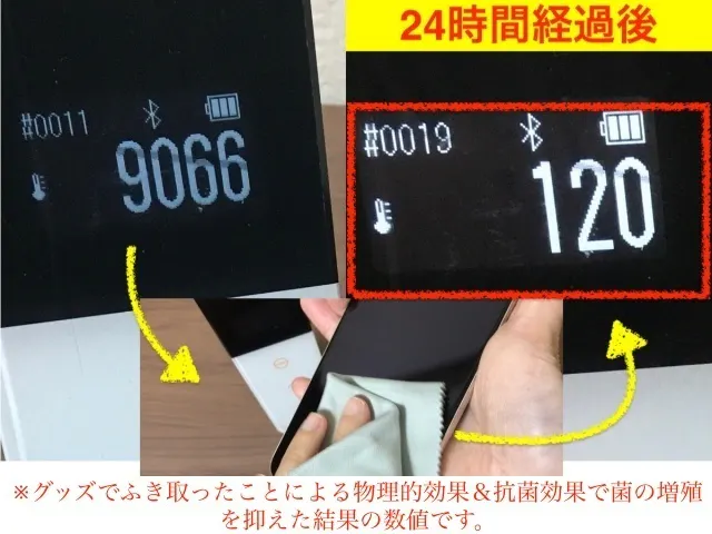 1minuteで画面を拭いて、24時間放置した後の数値がこんなに低下!!