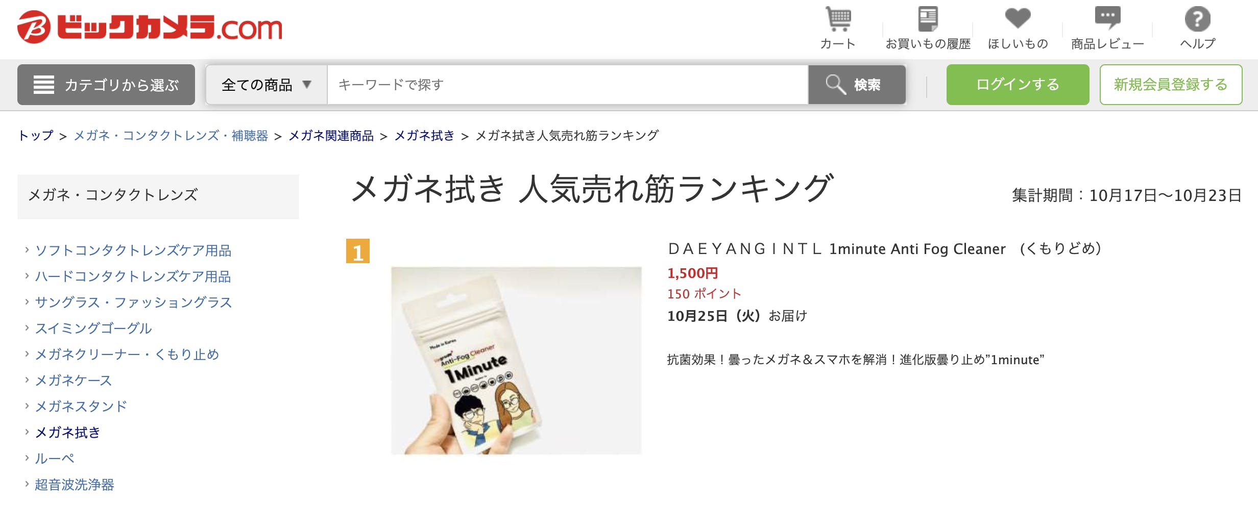 2022/10/24 18:00皆様「1minute Anti-Fog Cleaner」実行者の今村です。この度はビックFIRE企画にノミネートいただくこととなり、今現在ビックカメラ有楽町店舗とECサイトにて販売させていただいております。なんと、「メガネ拭き」ランキングで1位となりました!!https://www.biccamera.com/bc/ranking/001/270/045/021/皆様本当にありがとうございます!だんだんと寒い日々が近づいてまいりました。皆様お体にはお気をつけてお過ごしくださいませ。 もっと見る