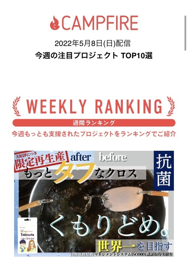 先週の日曜日5/8のCAMPFIREメルマガにて、今週最も支援されたプロジェクト10選に選ばれました!