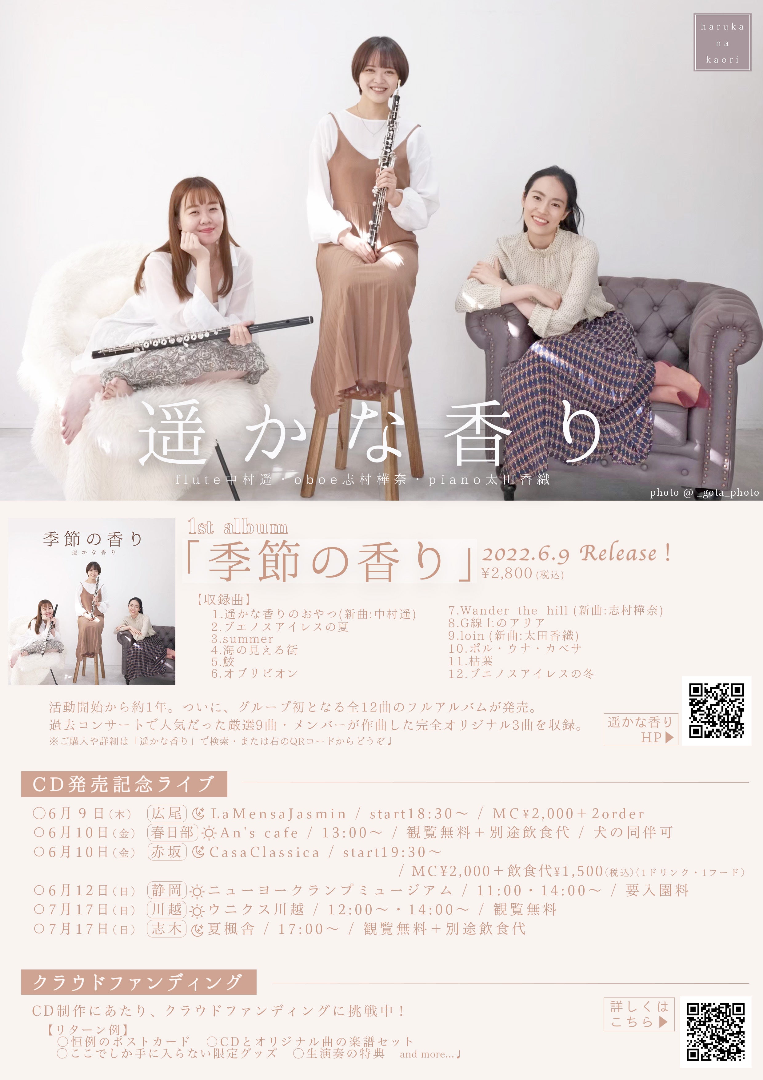 本クラウドファンディングから約1年が経ちました!お元気ですか?日本列島。クラファン担当の志村です! 改めて、1stアルバムには多大なご支援をいただきまして、本当にありがとうございました! 私たちはというと、1stアルバムへのご支援でMV制作まで(残り2曲の外撮影は雨や志村のコロナ感染等で3回ほど延期しておりまだ撮れていませんが…)にかかる費用を差し引いた残りの金額と、1stアルバムの売上を頼りに、今年もCDを作って活動しよう!という方針になりました。クラファンもせず2枚目ということで正直、製作費用まで回収できなかったらどうしようという不安はありますが、皆様にもっと楽しんでいただきたい(特にオリジナル曲は鴻巣のライブ映像では会場が響きすぎて掴みどころのない音源になってしまっていたので…一度良い音で楽しんでいただきたい!)という思いがここまで事を進められた原動力だなぁと思います。 今年も豪太さんの素敵な写真が載った、かおさんの素晴らしい文才がひかる遥さんデザインのブックレット、棒茄子輸送車をお楽しみに!() 1stアルバムの時と同様、各所にてレコ発ライブを行います!立川を除く各会場にてCDのご購入も可能です!是非私たちに会いに来ていただけたら嬉しいです!お待ちしています! <川越> 6月3日㈯ ①12:00start ②14:00start 会場:ウニクス川越1Fエスカレーター裏/観覧無料 https://www.unicus-sc.jp/kawagoe/ <志木> 6月3日㈯17:00start 会場:おとぎのティールーム夏楓舎/観覧無料+別途飲食代 https://m.facebook.com/kaedeyashiki/ 要予約:https://docs.google.com/forms/d/e/1FAIpQLSeINEANKJSKqc2nTXln6R-_Ip4IlWX35hA-jkLhtqauMvJ_3g/viewform <港区> 6月8日㈭ ①19:00start ②20:30start 会場:メズム東京 観覧無料 https://www.mesm.jp/showcase/2023/06/20230608.html <春日部> 6月9日㈮ 13:00start 会場:An'sCafe/観覧無料+別途飲食代/犬の同伴可 https://sk-sp1.com/ans-cafe/ 要予約:https://docs.google.com/forms/d/e/1FAIpQLSeINEANKJSKqc2nTXln6R-_Ip4IlWX35hA-jkLhtqauMvJ_3g/viewform <静岡> 6月11日㈰ ①12:00start ②14:30start 会場:ニューヨークランプミュージアム内/観覧無料・要入園料 中学生以上1400円・小学生700円・幼児400円(入園料は変更になる可能性があります) https://nylfmuseum.com/ <日野> 6月21日㈬19:00start 会場:イオンモール多摩平の森1F森のキッチンコート/観覧無料 https://tamadairanomori-aeonmall.com/ <立川> 7月12日㈬12:20start 会場:たましんRISURUホール(立川市市民会館)1階ロビー水曜コンサート/観覧無料 https://www.tachikawa-chiikibunka.or.jp/a22-20230712/ <赤坂> 7月22日㈯18:30開場、19:30開演 会場:CasaClassica/料金¥3000+飲食代1,500円(税込)(1ドリンク・1フード) https://casa-classica.jp/ 要予約: https://ticket.tsuku2.jp/events-detail/26310401451220