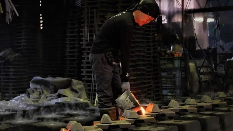 湯汲(ゆくみ)に入った鉄を型に流し込む工程。鉄の温度が製品の良し悪しを左右するため、肉眼で見極めながら作業にあたる。↑画像の作業者は専務 菊地章氏。