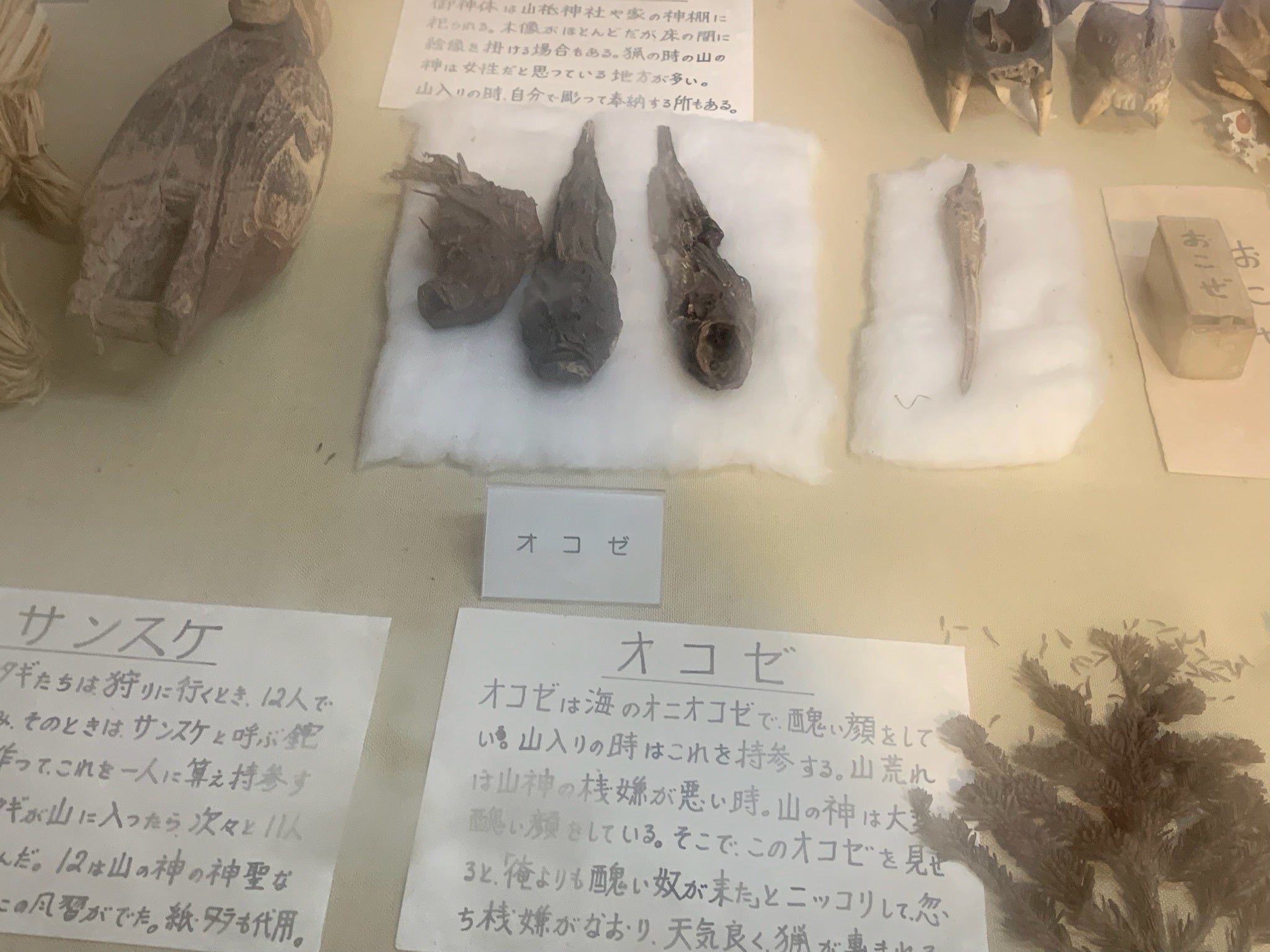 マタギは山に入るとき、乾燥させた「オコゼ」を紙に包んで常に持ち歩いていていました。天候が荒れると、袖から少し出して山の神に見せるのです。山の神は「女神」で「醜い顔」をしていると言われていました。したがって、見た目がよくない「オコゼ」を見せると、世の中に自分よりもまだ醜いものがあることを知って機嫌がよくなり、天候が回復すると信じられていました。オコゼの干物には御守の意味合いがあるのです。