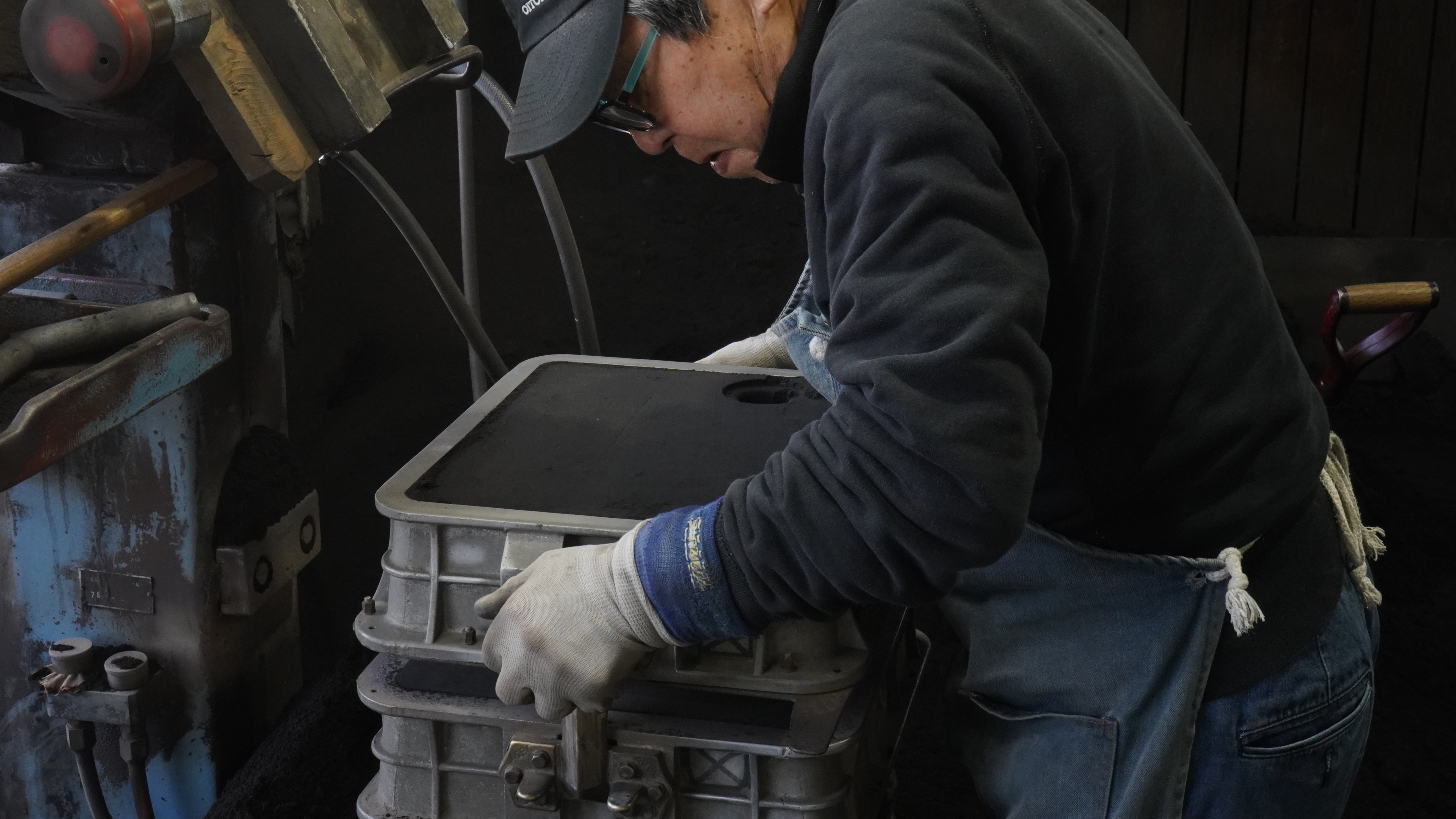 鉄器の型を作る様子。生型製法と呼ばれる技法。砂の調合、水分量、細かさを管理するには熟練の技が必要です。