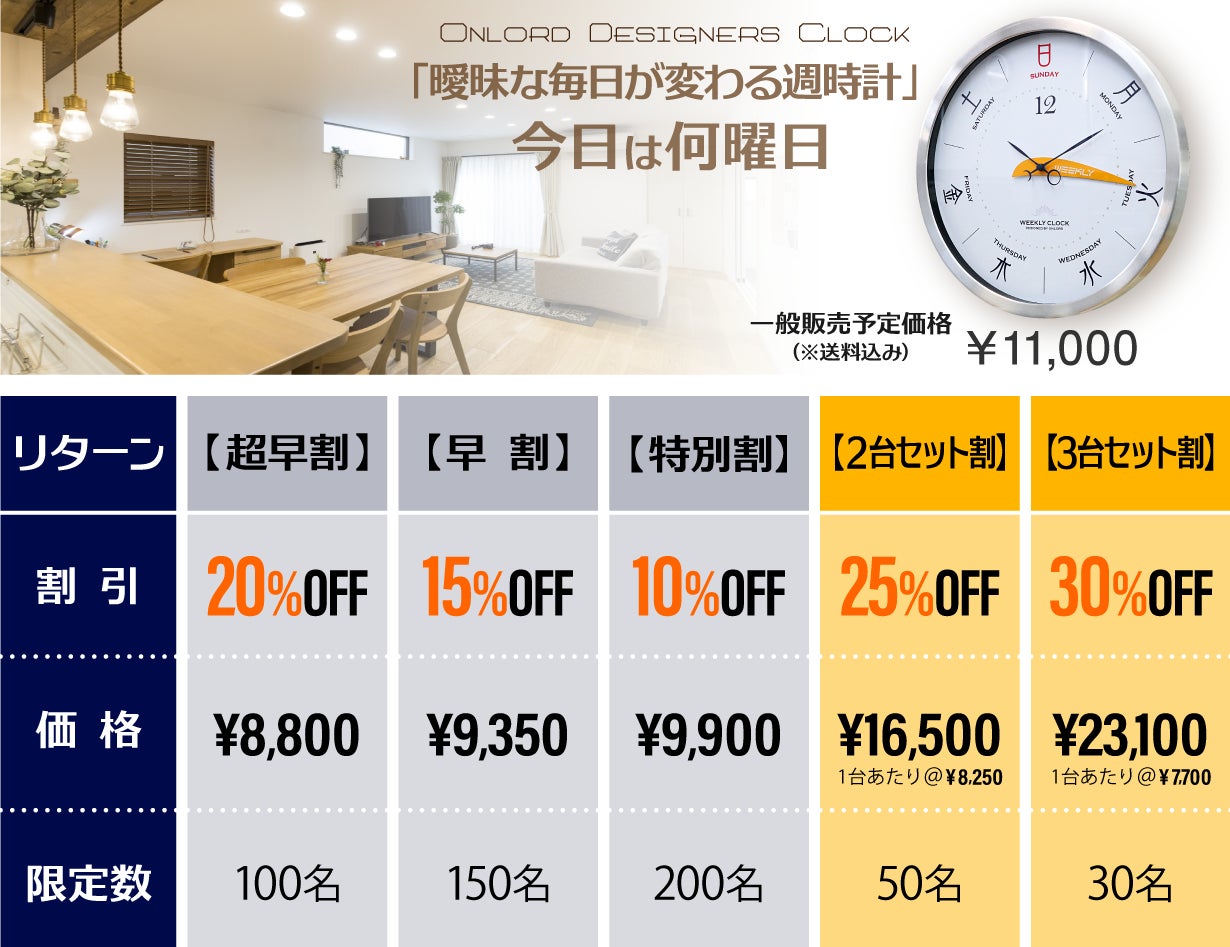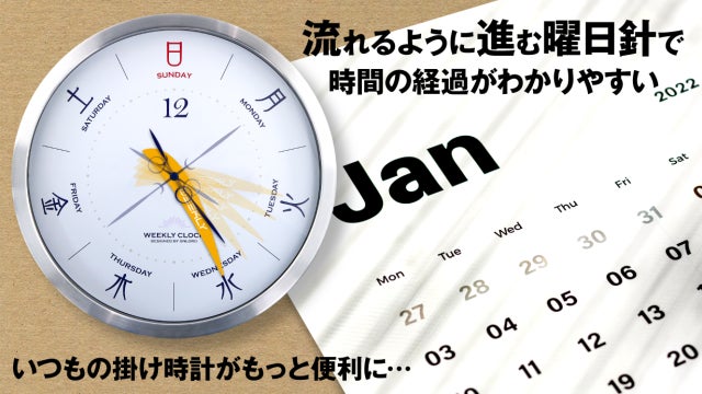 2022/06/01 13:06皆様、こんにちは。本日より、1週間の時間の流れを視覚で捉えられる、全く新しいコンセプトの掛け時計『今日は何曜日?』のプロジェクトを開始いたしました。コロナウイルスの影響でリモートワークを行う企業が増え、企業によってはそのまま通常業務がリモートワークになり現在も継続しておられる方も多いのではないでしょうか。そんな日々を過ごす中で「今日は何曜日だっけ?」と ふと自問自答することや、一瞬不安になることが増えていませんか?『今日は何曜日?』があれば「リモートワーク続きで失った曜日感覚を取り戻す」ことも可能になります。また、日々の生活の中で、皆様は「時間」というものをどれだけ意識されていますでしょうか。日本人の平均寿命は世界でも1位2位を争うほど長寿ではありますが、長く生きる中で時間を効率的に使っている人のほうが、人生の充実度も高いと言われています。『今日は何曜日?』の曜日針は、日が変わるときにカチャッと一瞬で切り替わるのではなく、時間の経過とともに徐々に移動していきます。通常の時計であれば、曜日も日付も 日が変わるときに一瞬で切り替わりますが、あえてそうしなかったことが『今日は何曜日?』のこだわりでもあります。時間の経過だけではなく「1日の経過」も視覚的に捉えられるので、大人だけではなく、お子様の自己管理能力やスケジュール管理能力を育成することにも繋がります。デザインに関しても、数十種類のデザイン案を起こした中から、老若男女問わず、しっかりと曜日を判断することができることを大前提に漢字表記としたうえで、どんなご家庭にも取り入れることができるシンプルなデザインとしました。ぜひ、皆様の生活の中にも『今日は何曜日?』を取り入れて、ご自身の時間を管理することを意識した「時間に追われない生活」を手に入れてください。 もっと見る