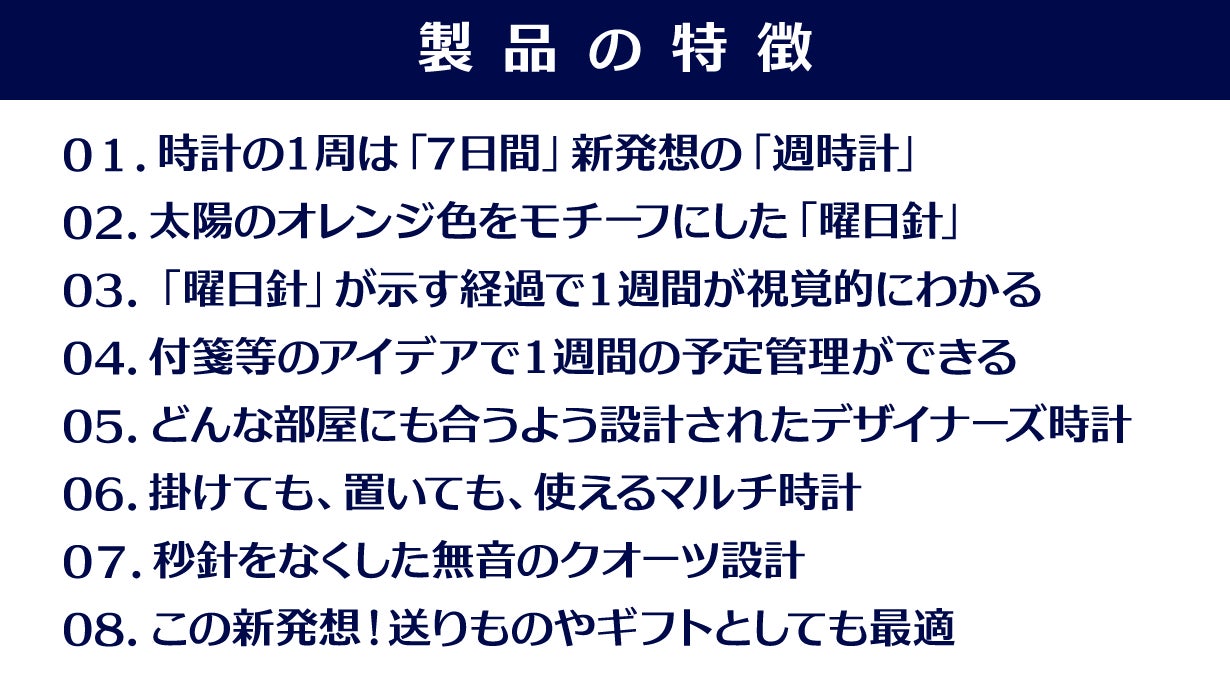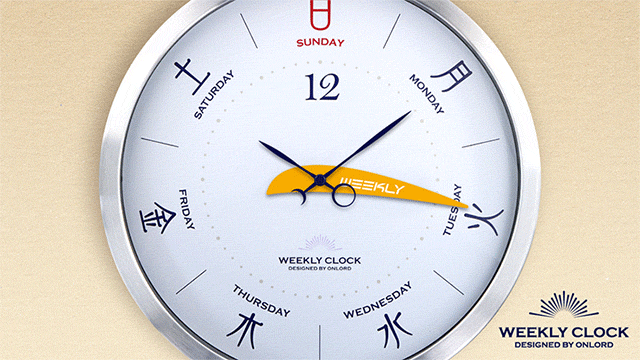 現在「月日」も「曜日」も表示できるデジタル時計はあれど、どれもアナログ時計のように視覚的に時間の流れを把握することはできない。曖昧に過ぎ去る1週間、忙しい日常の中で「1週間を管理」できる時計はないか。コンセプトは「1周は7日間」、「日曜日」を基準とし、日々やり過ごしがちになってしまう、週の経過と残り時間のタイムマネージメントを容易にする。「曜日」基準とした7分割のデザイン。 これにより”1週間を見える化”、週の経過が”視覚でわかる”「週時計」が完成した。