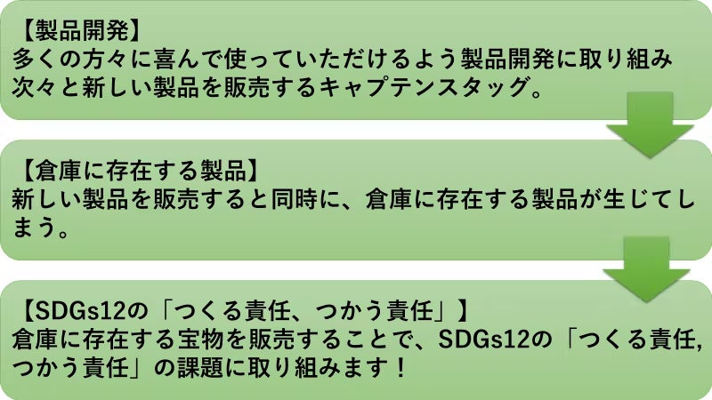 持続可能な社会を目指すうえで、倉庫に眠ってしまう商品を皆様にお届けすることはとても重要なことです。その観点からみると、私たちはそのような倉庫に眠ってしまう商品が"宝物"にみえました。