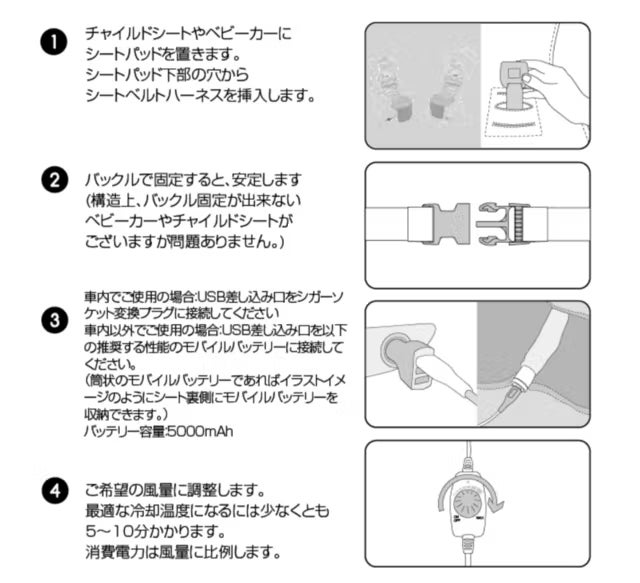 ベビーカー・チャイルドシートに付属しているインナークッション等を利用している場合には取り外し設置して頂くか、TAOTAOクーラーファンシートと併用する場合には、お子様の安全を最優先にご利用をお願いいたします。