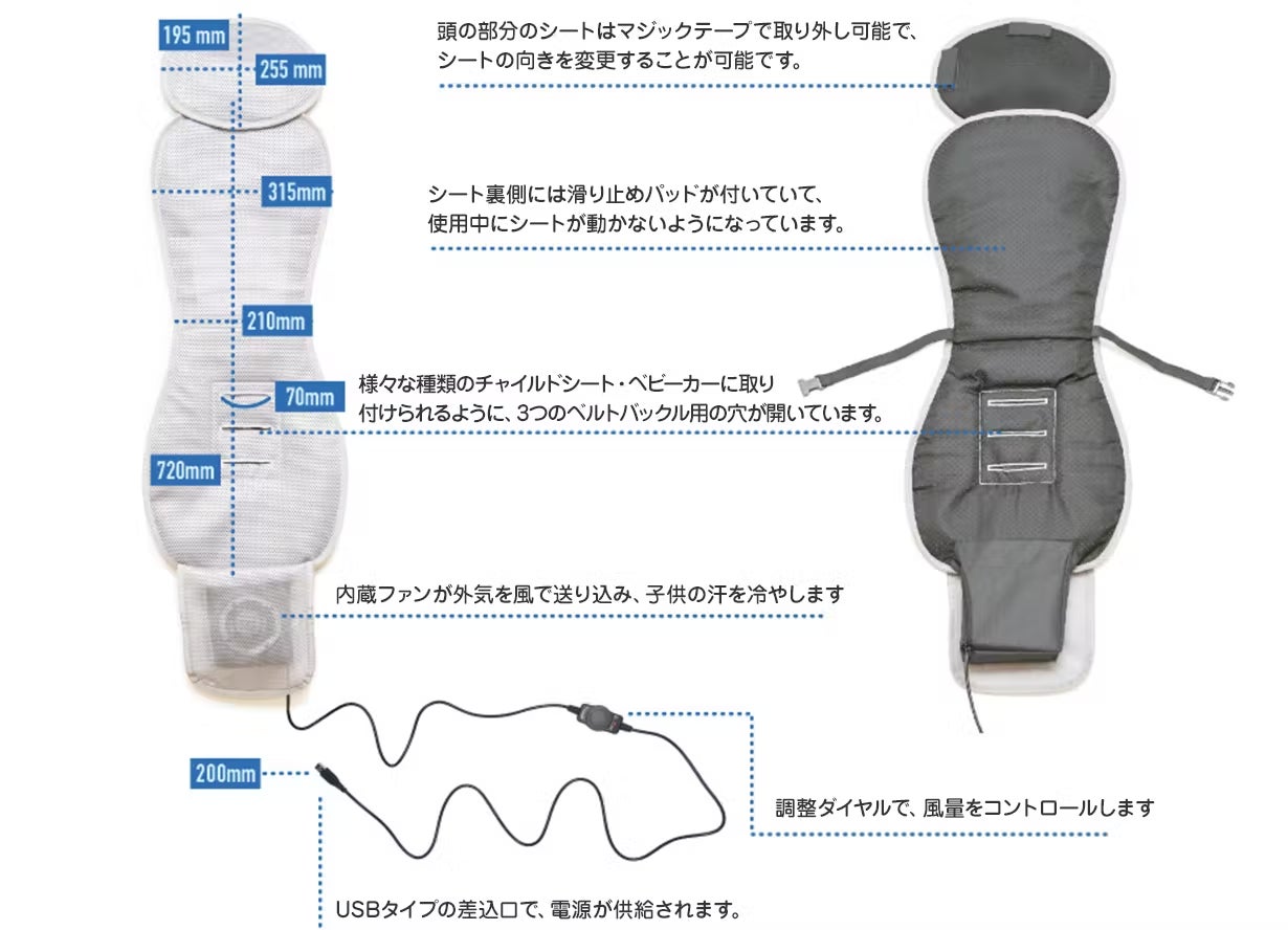 「クーラーファンシート」はベビーカーやチャイルドシートに敷くだけで、子供が涼しく快適に過ごせる“ファン付きクーリングシート”です。