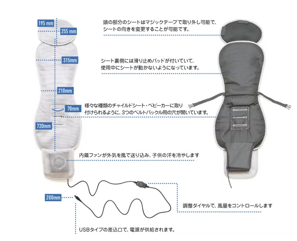 ・メッシュ素材を使用し、ファンからの風がシート全体に均一にいきわたるようにします!