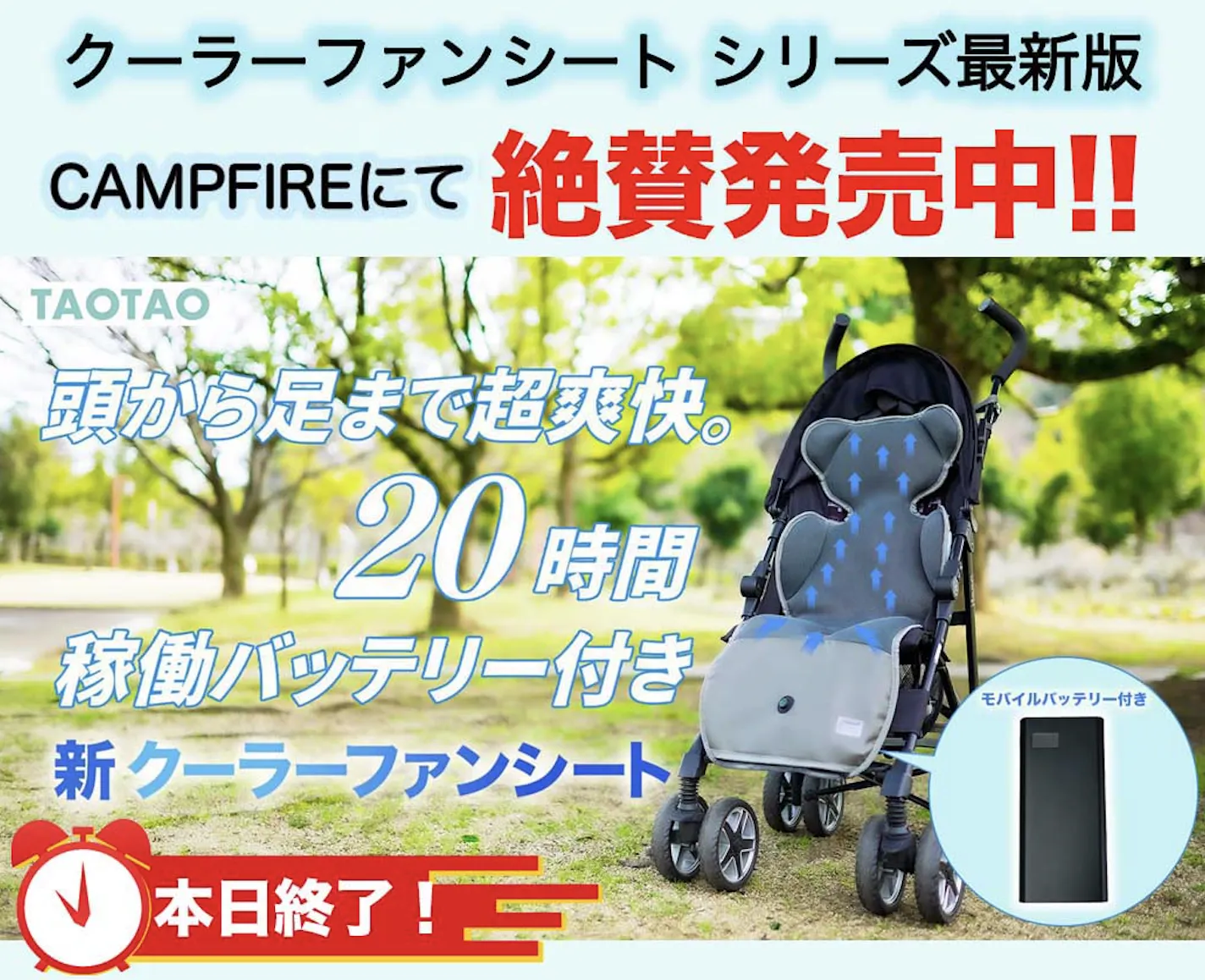 2024/07/19 11:00こんにちは、TAOTAOストアーです。梅雨が明けて、夏本番となってきました!そんな中、「ベビークーラーファンシート最新版」のプロジェクト終了まであと3日となりました! 今年は猛暑が続くと予想されています!今月下旬には商品を発送する予定ですので、この夏まだまだご活用いただけるかと思います。割引価格での販売はしばらくは行いません。お得な価格で商品がゲットできるラストチャンスですので、是非お早めのご購入をお勧めします! 今シリーズは、専用のモバイルバッテリーが付属しておりまして、利便性がかなり上がっている商品に仕上がりました 今シーズンまだまだ大活躍すること間違いなしです!ご興味ある方は、ぜひご検討いただけましたらと思います。商品ページ:https://camp-fire.jp/projects/758069また今年は、ペットバージョンのクーラーファンシートも販売しております!こちらも残り3日ですので、ご興味ある方は、ぜひご検討いただけましたらと思います。ペットクーラーファンシート商品ページ:https://camp-fire.jp/projects/758070 もっと見る