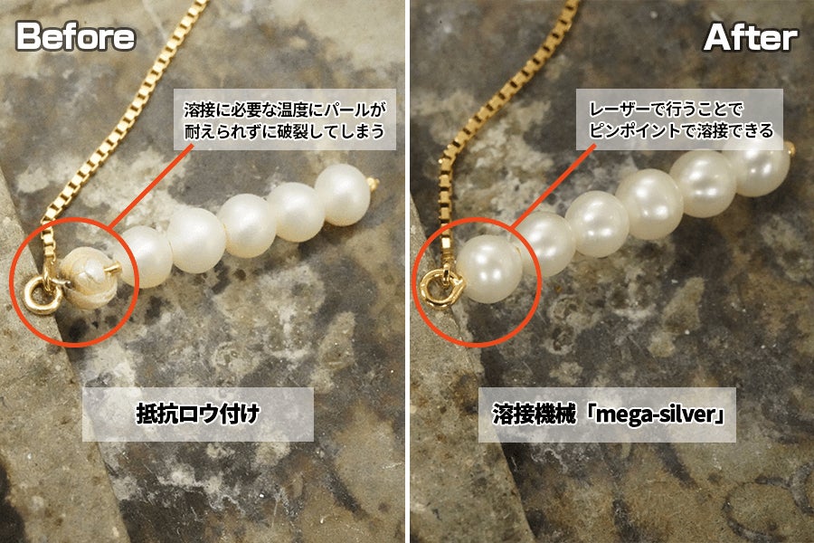溶接機械の「mega-silver」ですと、レーザーでピンポイントに溶接できるためパールが割れることなく、綺麗なまま溶接できるようになります。