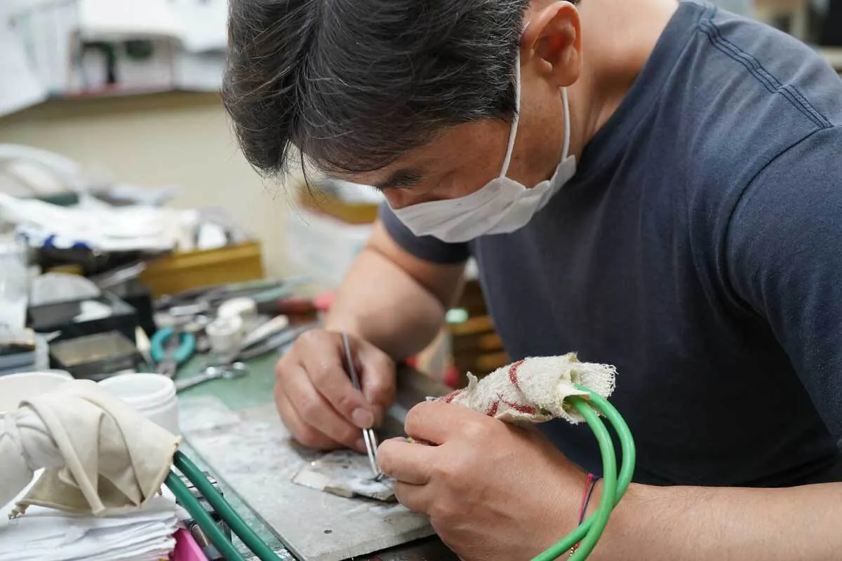 今までのやり方だと「抵抗ロウ付け」という技法になります。しかし、この方法だと熱が広範囲に伝わってしまい、近くにあるパールがその温度に耐えられずに破裂してしまいます。