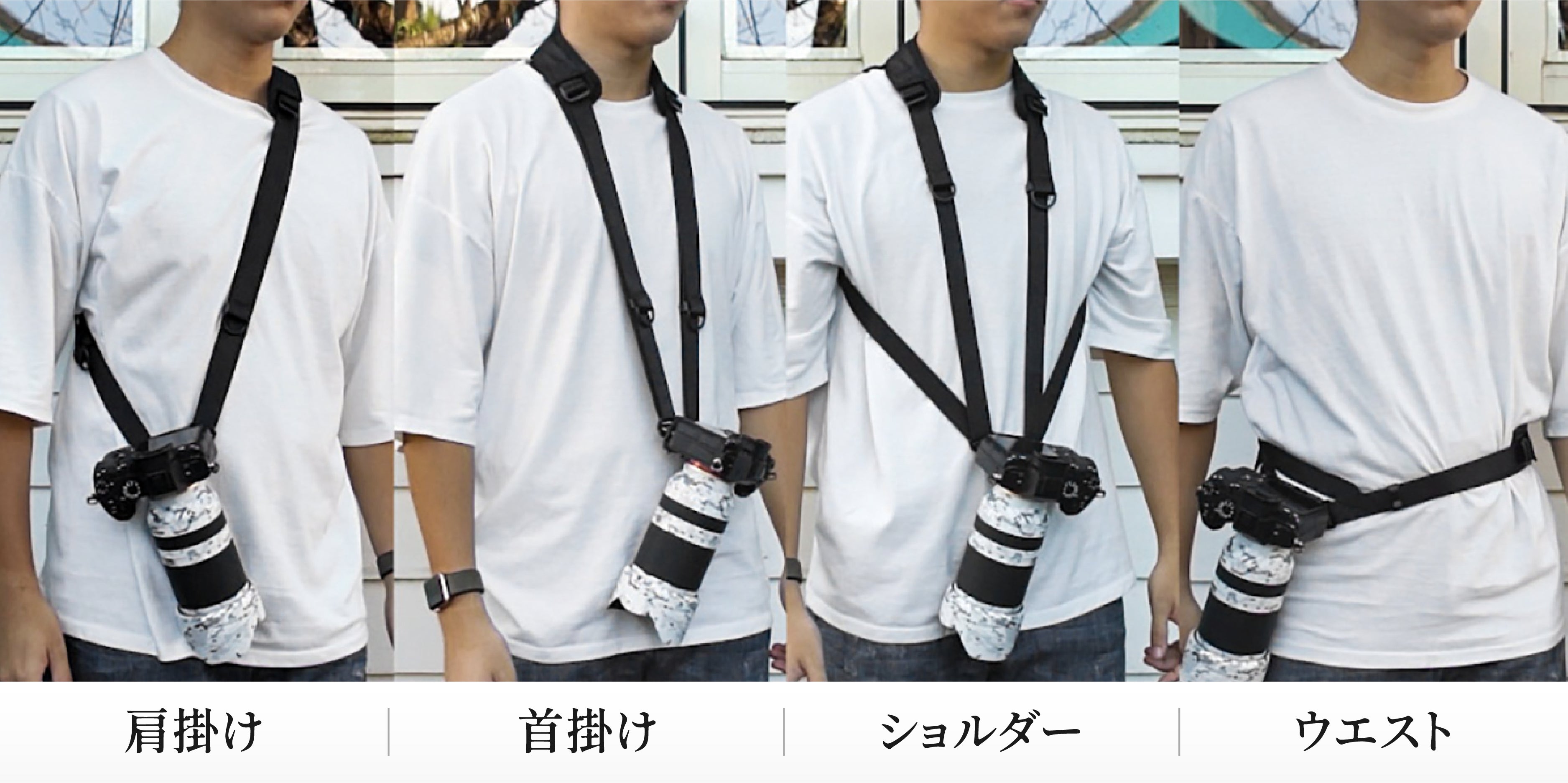 「pi Strap SPORT」は2秒でネックモードとショルダーモードを切り替えが可能。カメラの重みを分散する事ができ、首周りのストレスを軽減できます。長時間撮影してもストレスなく快適!