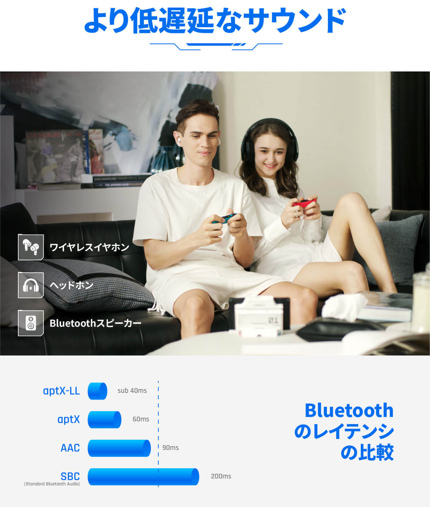 任天堂は、ついにBluetoothオーディオをアップデートしました!ですが、レイテンシは合格点ギリギリ(SBC)という声を聞きました。そこで極限までラグをなくすために、aptX-LLを搭載したBluetooth 5.0版(オプション)をご用意いたしました。トップクラスのQualcomm CSR8670チップを搭載し、音声遅延を40msまで低減しました。また、ヘッドホンを2台接続することもできますので、友達と楽しみを同じタイミングで共有できるようになりました。
