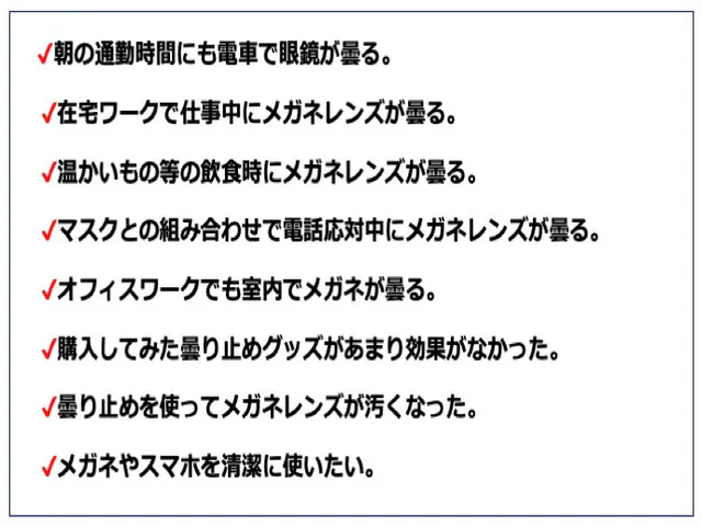 季節関係なくメガネとマスクの組み合わせで曇るレンズにストレスを感じておりませんでしょうか?